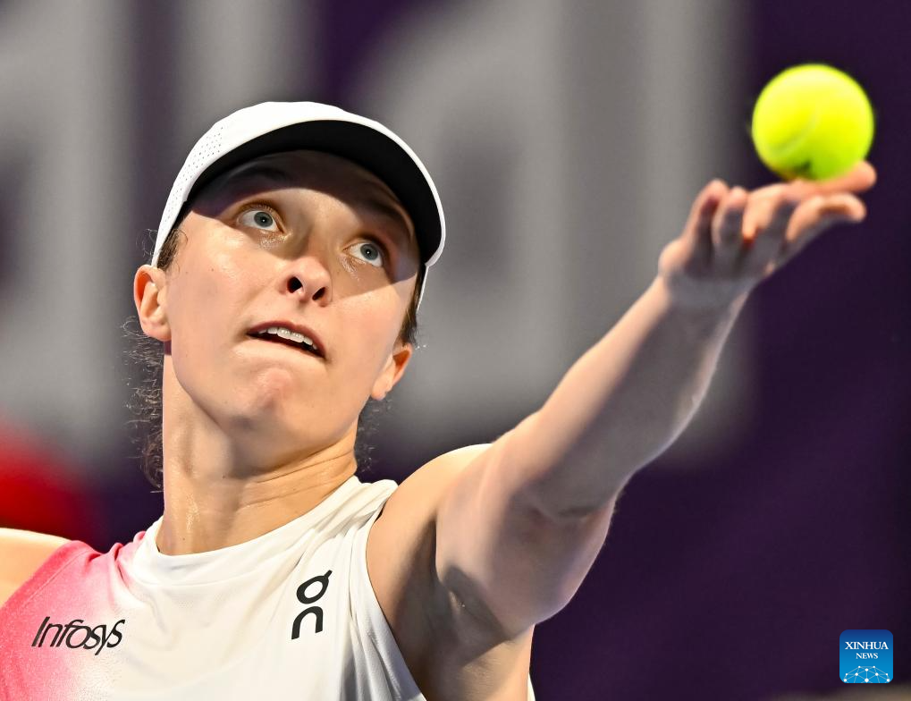 Iga Swiatek of Poland serves during women's singles round of 16 match between Iga Swiatek of Poland and Linda Noskova of the Czech Republic at the WTA Qatar Open tennis tournament in Doha, Qatar, Feb. 12, 2025. (Photo by Nikku/Xinhua)