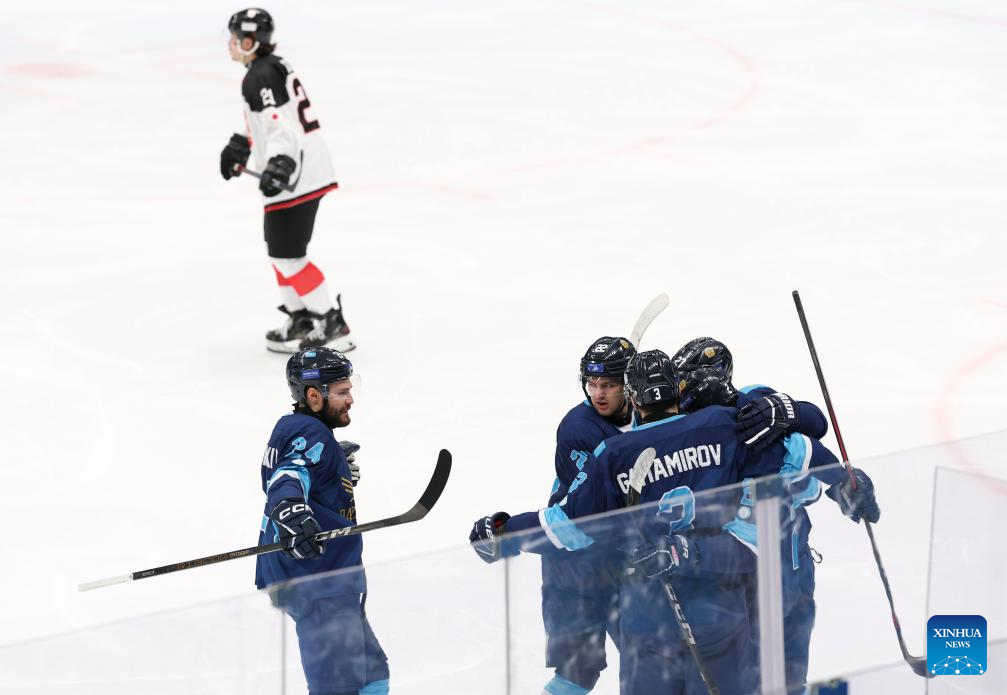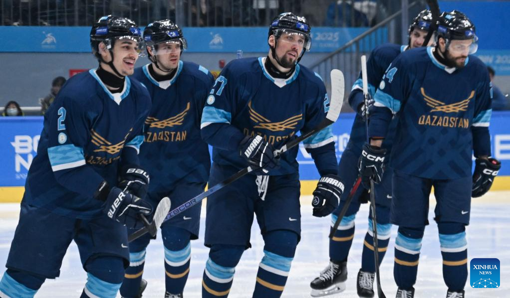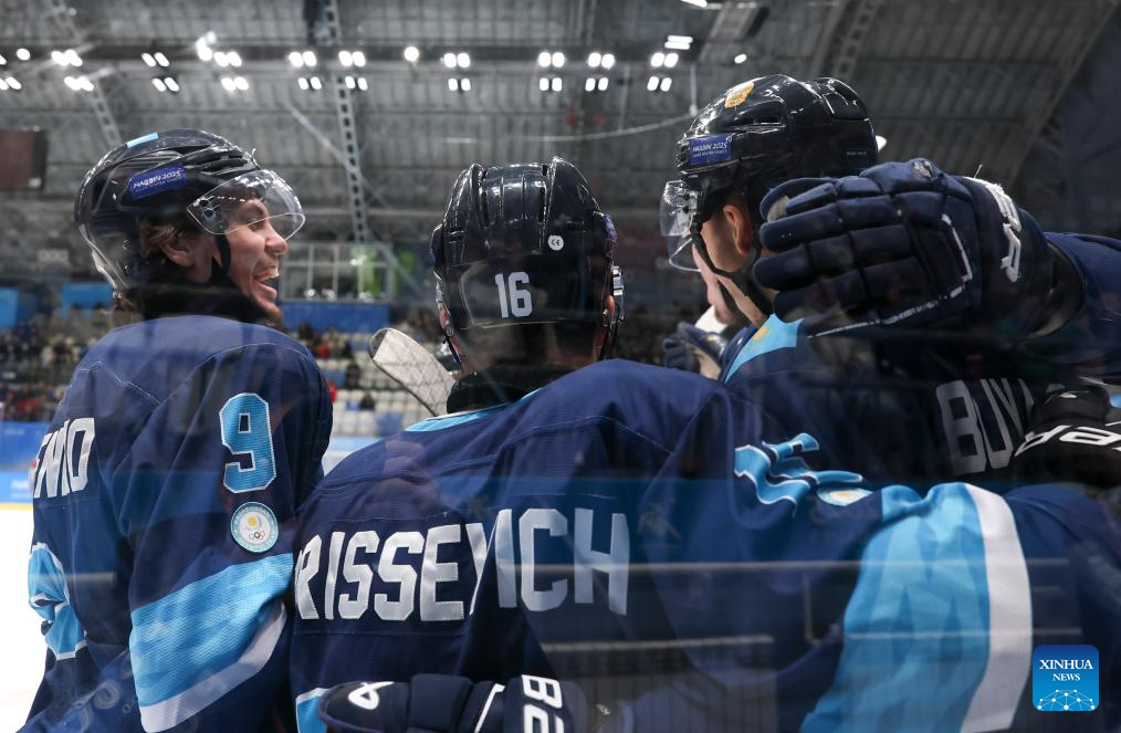 Players of Kazakhstan celebrate scoring during the men's ice hockey gold medal match between Kazakhstan and Japan at the 9th Asian Winter Games in Harbin, northeast China's Heilongjiang Province, on Feb. 14, 2025. (Xinhua/Yang Lei)
