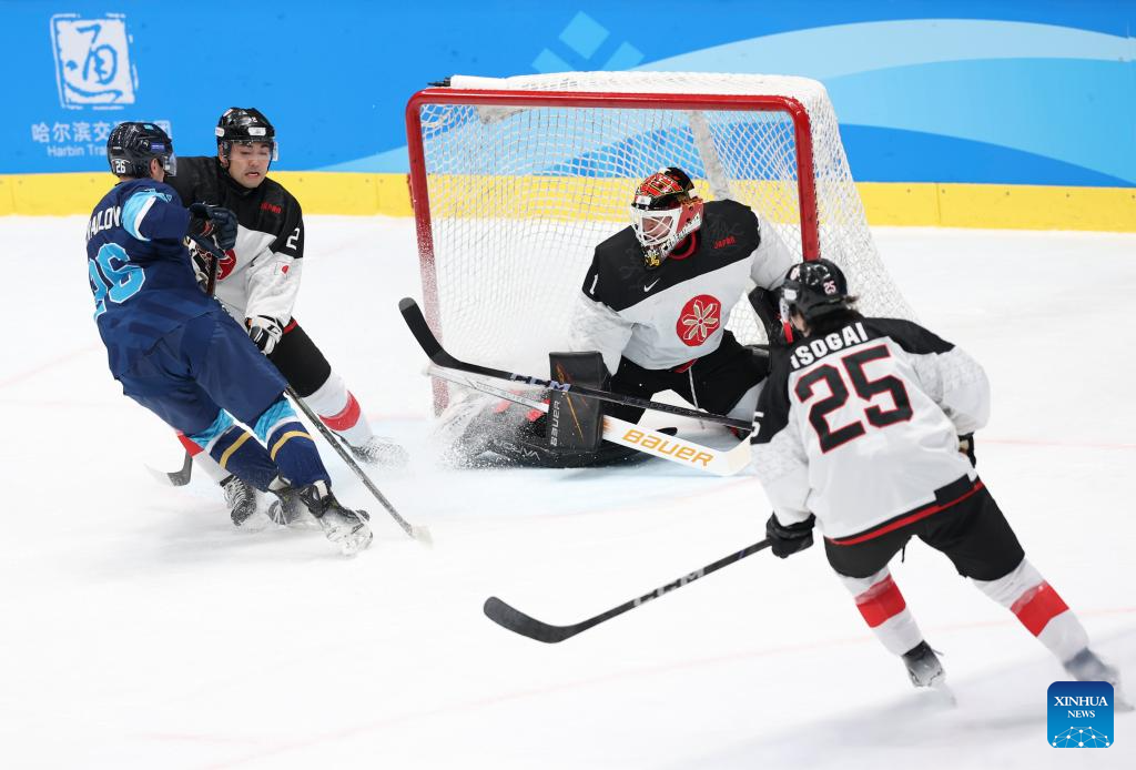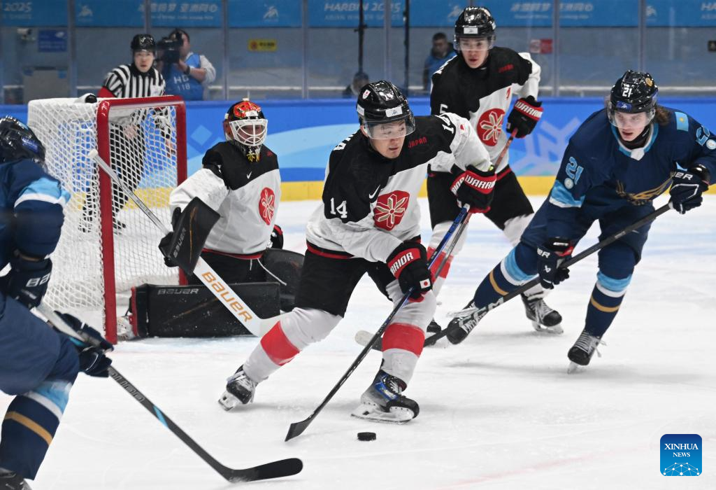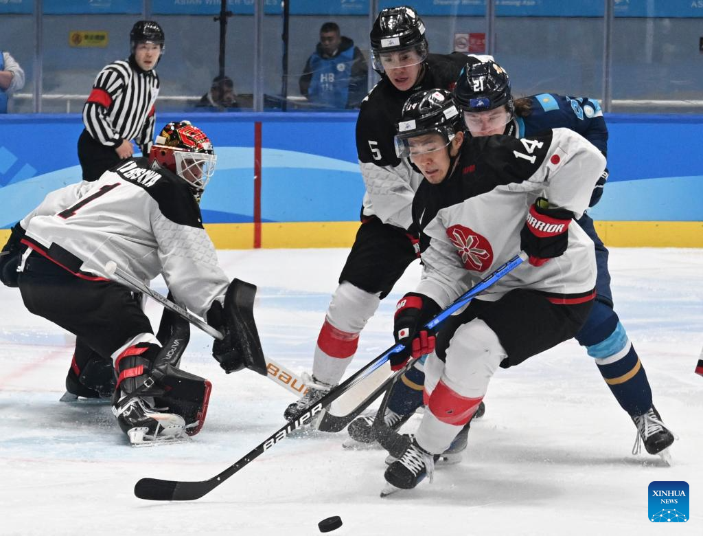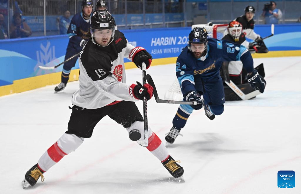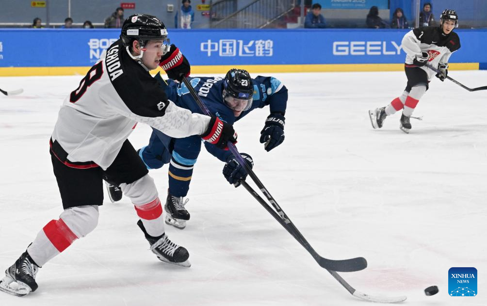 Osawa Yuto (2nd R) of Japan competes during the men's ice hockey gold medal match between Kazakhstan and Japan at the 9th Asian Winter Games in Harbin, northeast China's Heilongjiang Province, on Feb. 14, 2025. (Xinhua/Li Ziheng)