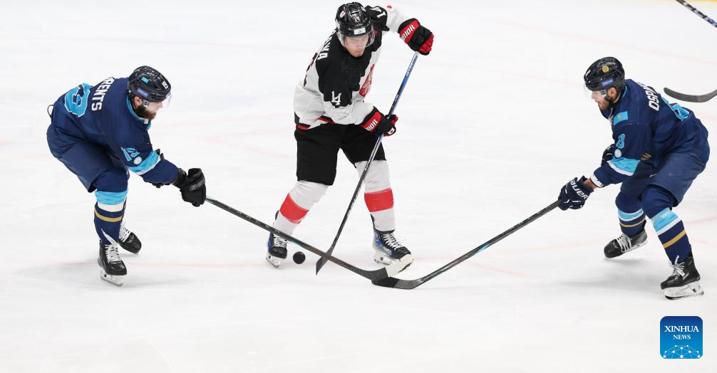 Artem Likhotnikov (1st R) of Kazakhstan competes during the men's ice hockey gold medal match between Kazakhstan and Japan at the 9th Asian Winter Games in Harbin, northeast China's Heilongjiang Province, on Feb. 14, 2025. (Xinhua/Yang Lei)