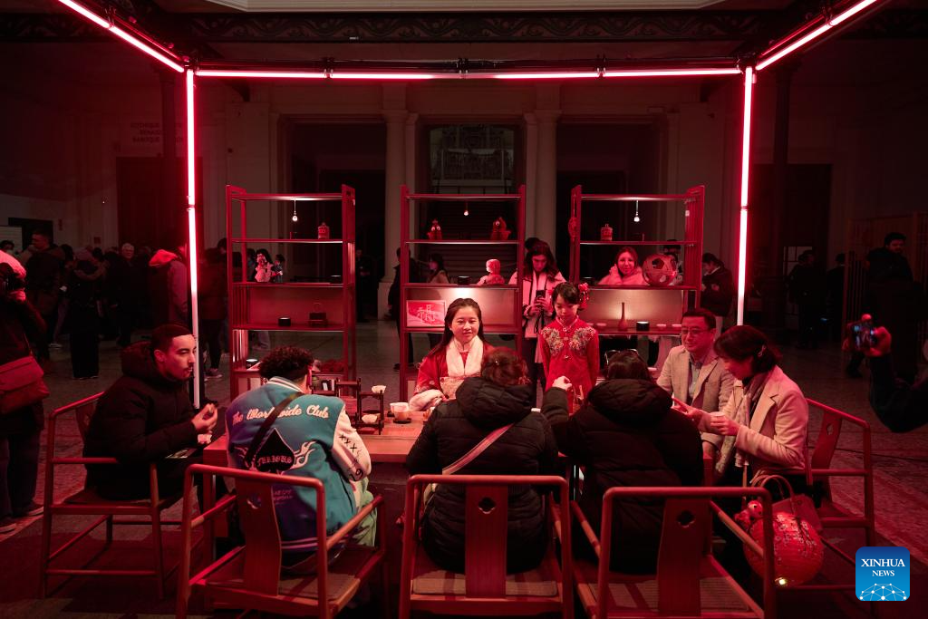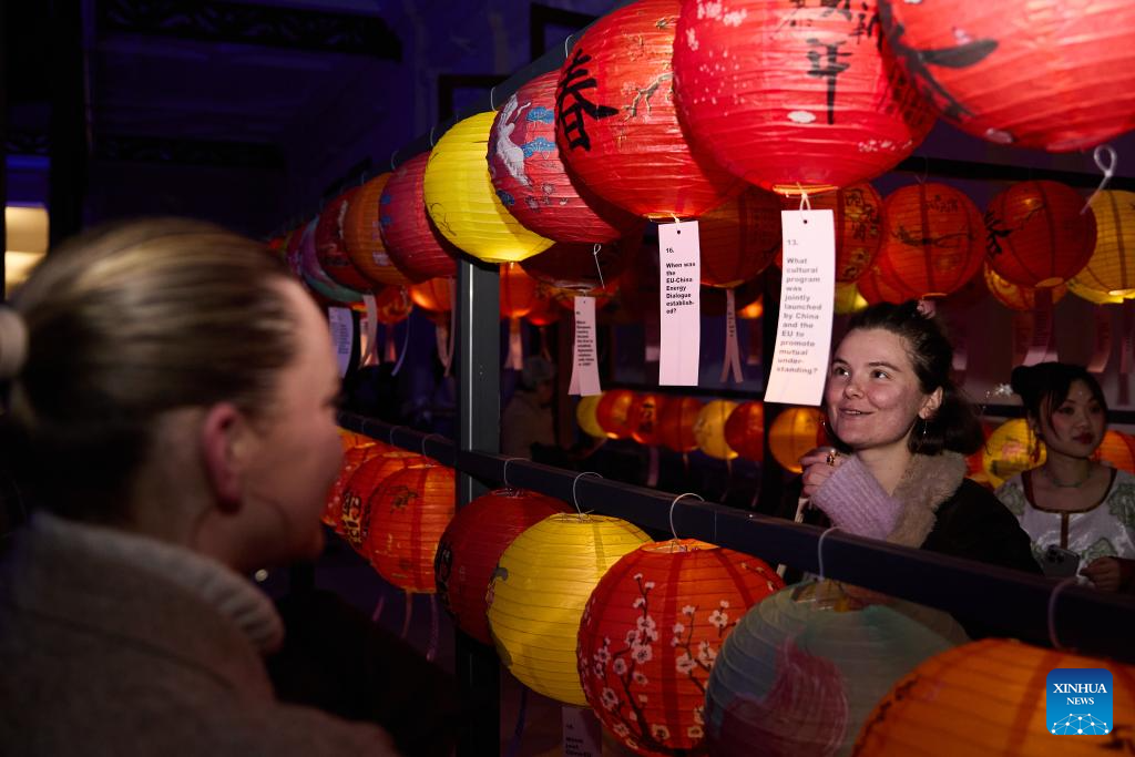 People visit the "Bright Tea House" at the Royal Art and History Museum during the Bright Festival in Brussels, Belgium, Feb. 13, 2025. The annual Bright Festival opened on Thursday night. Some thirty artistic light installations were set up, including installations with Chinese elements. (Xinhua/Meng Dingbo)