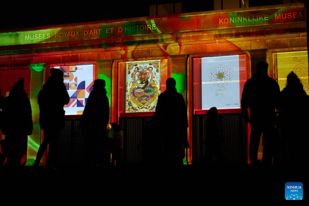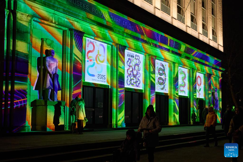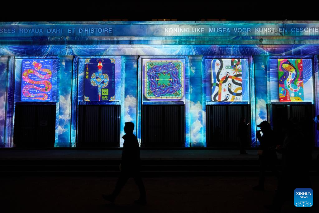 This photo taken on Feb. 13, 2025 shows light projections themed "Happy Chinese New Year of the Snake" at the Royal Art and History Museum during the Bright Festival in Brussels, Belgium. The annual Bright Festival opened on Thursday night. Some thirty artistic light installations were set up, including installations with Chinese elements. (Xinhua/Meng Dingbo)