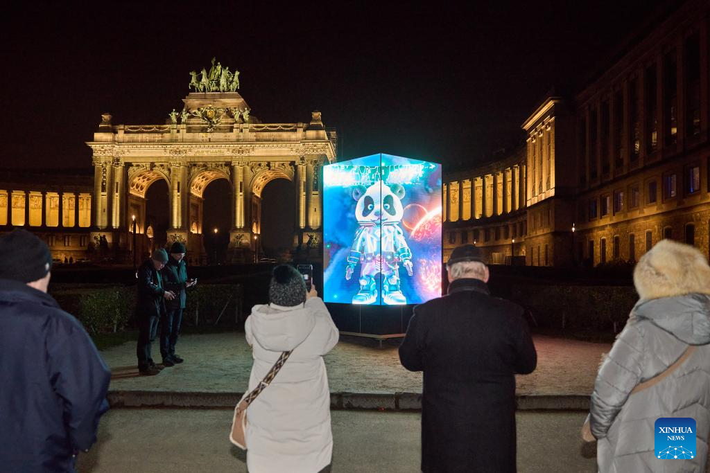 People visit a light installation called "Aris, the Panda Explorer from the Future" outside the Park of the Fiftieth Anniversary during the Bright Festival in Brussels, Belgium, Feb. 13, 2025. The annual Bright Festival opened on Thursday night. Some thirty artistic light installations were set up, including installations with Chinese elements. (Xinhua/Meng Dingbo)