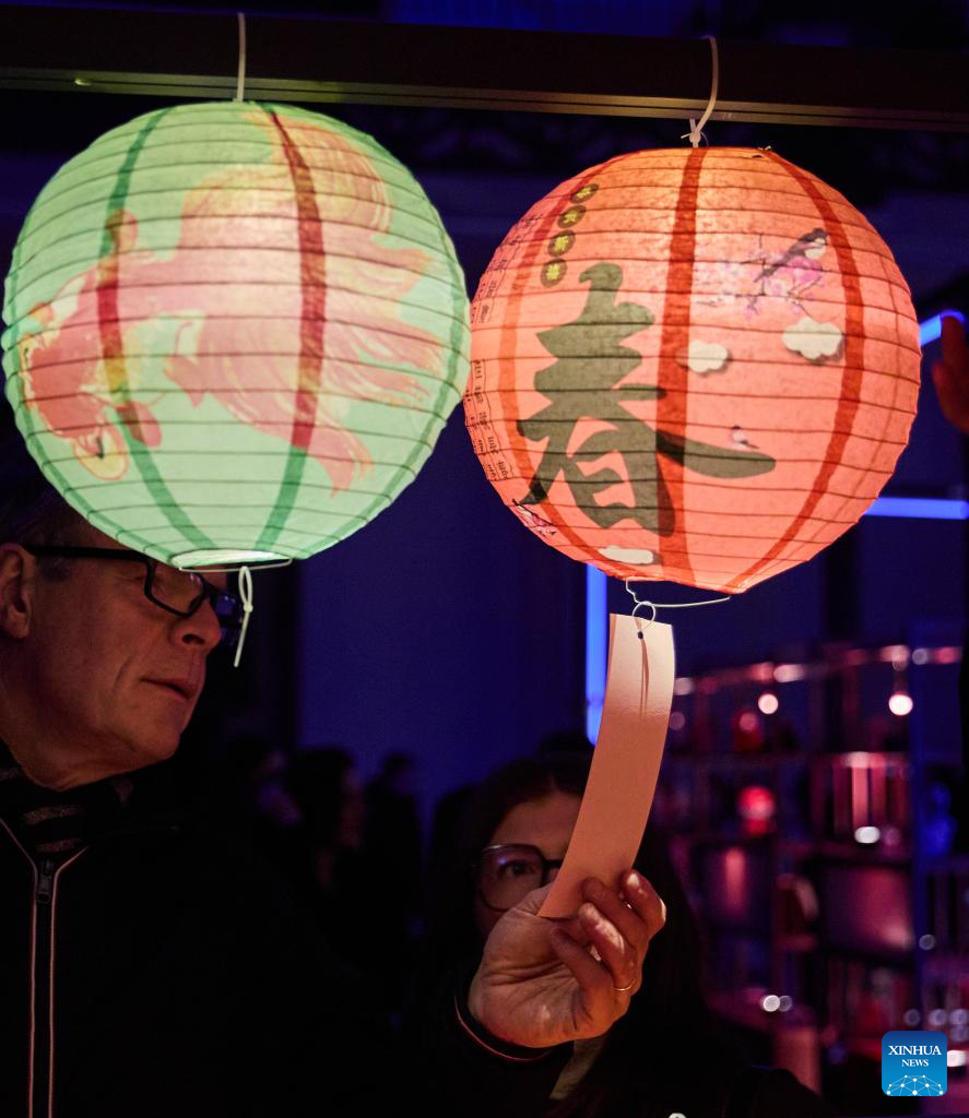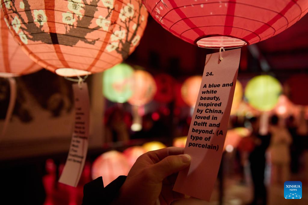 People read riddles at the Royal Art and History Museum during the Bright Festival in Brussels, Belgium, Feb. 13, 2025. The annual Bright Festival opened on Thursday night. Some thirty artistic light installations were set up, including installations with Chinese elements. (Xinhua/Meng Dingbo)