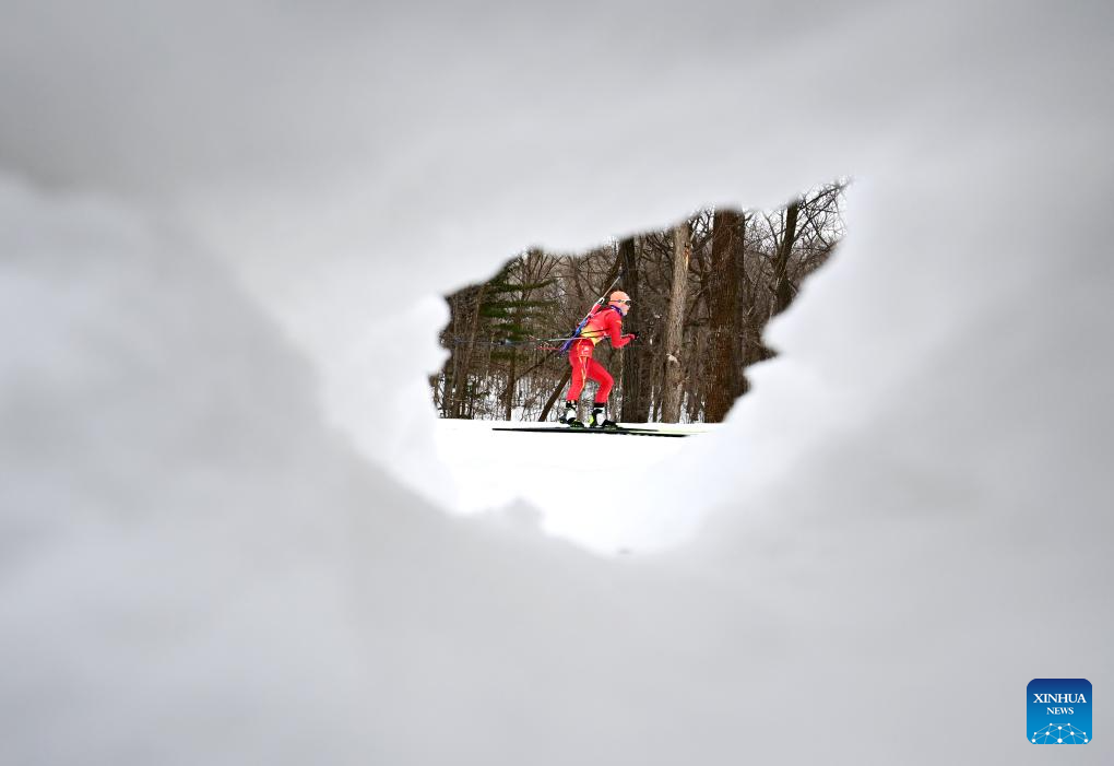 Tang Jialin of China competes during the Biathlon women's 4x6km relay match at the 9th Asian Winter Games in Yabuli, northeast China's Heilongjiang Province, Feb. 13, 2025. (Xinhua/Zhang Long)
