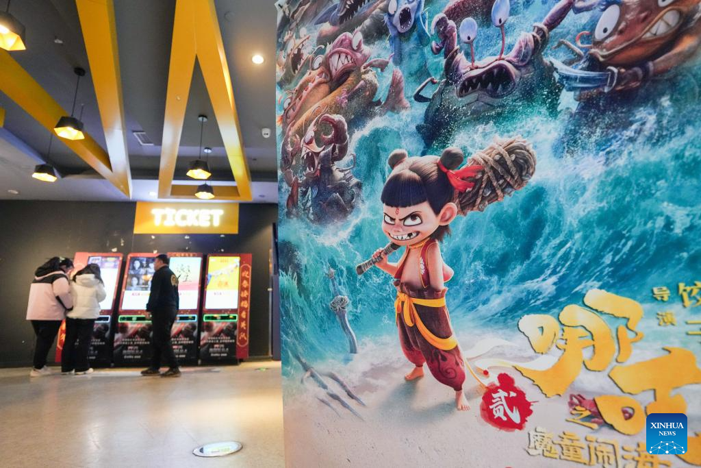 This photo taken on Feb. 13, 2025 shows a poster for the Chinese animated film "Ne Zha 2" at a cinema in Chaoyang District of Beijing, capital of China. Having amassed over 10 billion yuan (about 1.39 billion U.S. dollars) in global total earnings, including presales, "Ne Zha 2" is the first film to gross 1 billion U.S. dollars in a single market and the first non-Hollywood title to join the coveted billion-dollar club. With domestic earnings projected to surge past 15 billion yuan, the film is poised to become the highest-grossing animated movie of all time and one of the five top-grossing films globally. (Xinhua/Ju Huanzong)