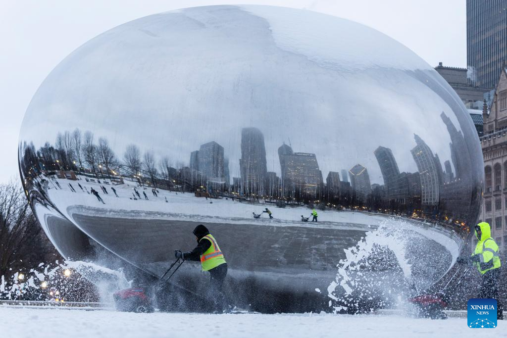 Park workers use snow blowers to clear the area around the Cloud Gate sculpture in Chicago, the United States, on Feb. 12, 2025. Chicago is bracing for its first major winter storm of the season as moderate to heavy snow blanketed the U.S. third largest metropolitan city Wednesday. (Photo by Vincent D. Johnson/Xinhua)