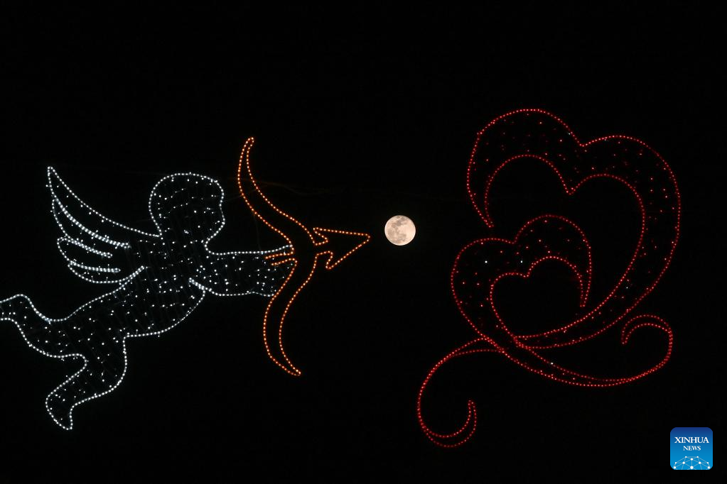 This photo taken on Feb. 13, 2025 shows light decorations to mark Valentine's Day in Hamrun, Malta. (Photo by Jonathan Borg/Xinhua)