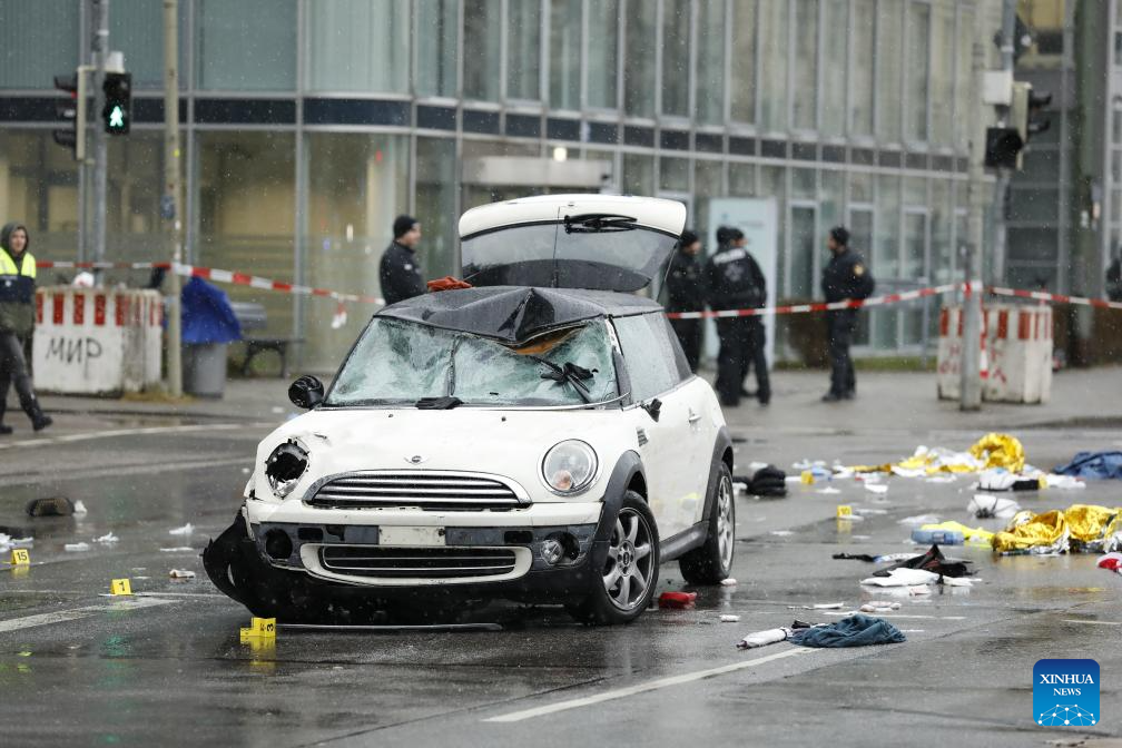 A damaged car is pictured at the site of a car-ramming incident in Munich, Germany, Feb. 13, 2025. At least 28 people, including children, were injured after a car plowed into a crowd in Munich, Germany, on Thursday, local police reported.
