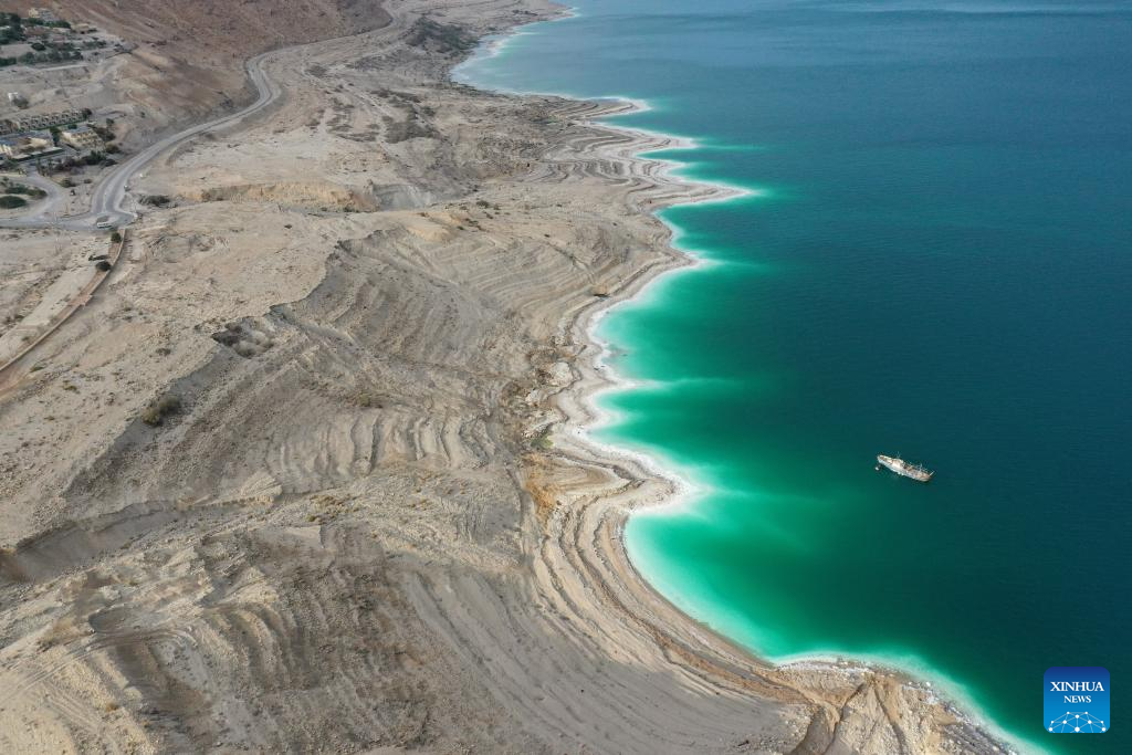 An aerial drone photo taken on Feb. 12, 2025 shows a view of the Dead Sea near Ein Gedi beach in Israel. (Photo by Gil Cohen Magen/Xinhua)