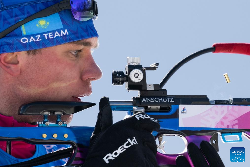 Vladislav Kireyev of Kazakhstan competes during the Biathlon men's 4x7.5km relay match at the 9th Asian Winter Games in Yabuli, northeast China's Heilongjiang Province, Feb. 13, 2025. (Xinhua/Wu Zhizun)