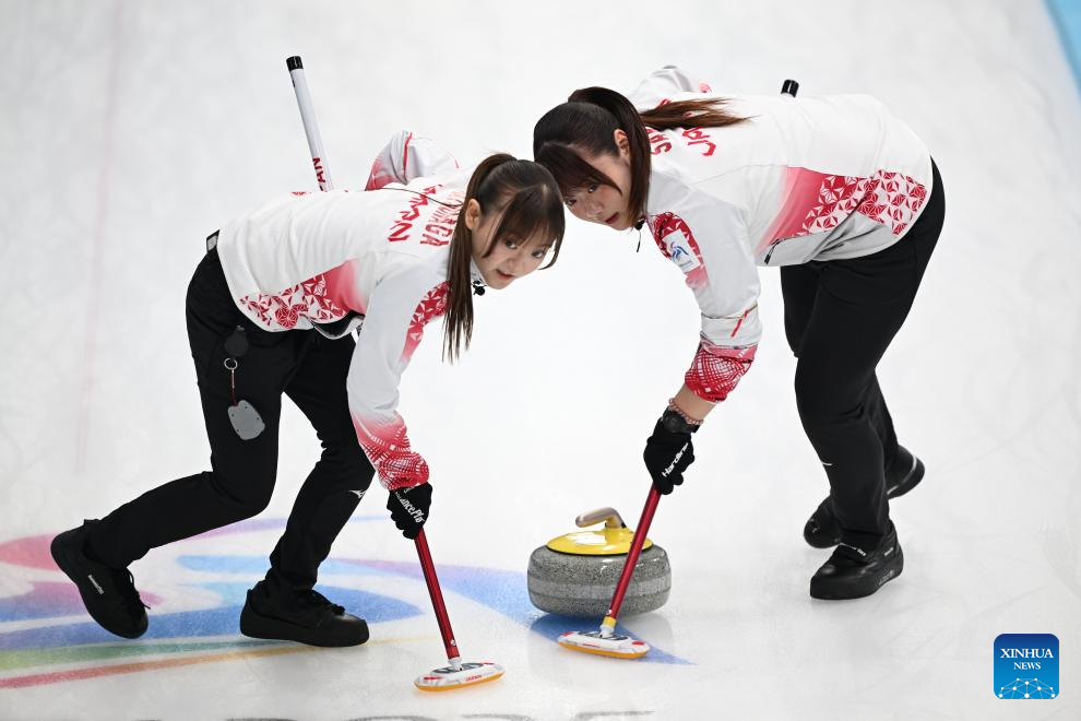 Matsunaga Ai (L) and Sakuma Yuna of Japan compete during the curling women's bronze medal match between Kazakhstan and Japan at the 9th Asian Winter Games in Harbin, northeast China's Heilongjiang Province, Feb. 14, 2025. (Xinhua/Li Jianan)