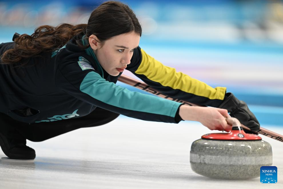 Yekaterina Kolykhalova of Kazakhstan competes during the curling women's bronze medal match between Kazakhstan and Japan at the 9th Asian Winter Games in Harbin, northeast China's Heilongjiang Province, Feb. 14, 2025. (Xinhua/Zhao Zishuo)
