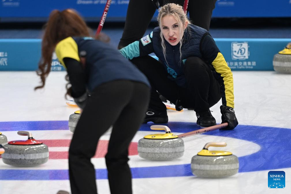 Angelina Ebauyer (R) of Kazakhstan competes during the curling women's bronze medal match between Kazakhstan and Japan at the 9th Asian Winter Games in Harbin, northeast China's Heilongjiang Province, Feb. 14, 2025. (Xinhua/Li Jianan)