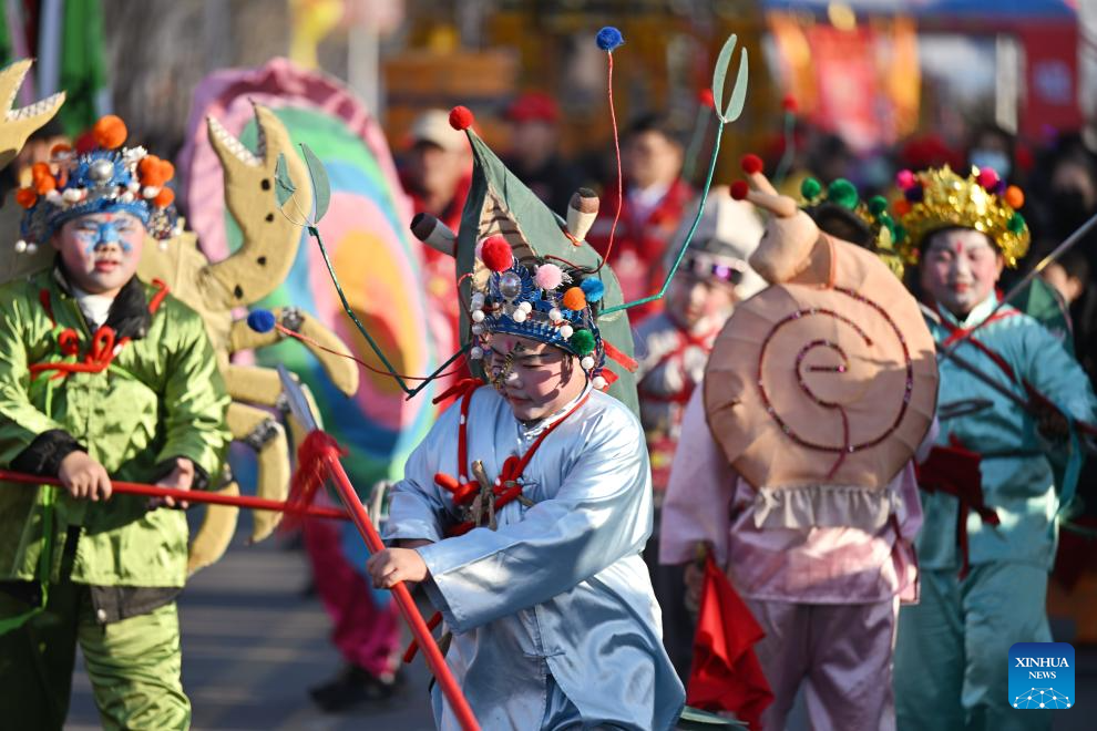 People perform during a memorial ceremony for Chinese sea goddess Mazu in north China's Tianjin Municipality, Feb. 13, 2025.