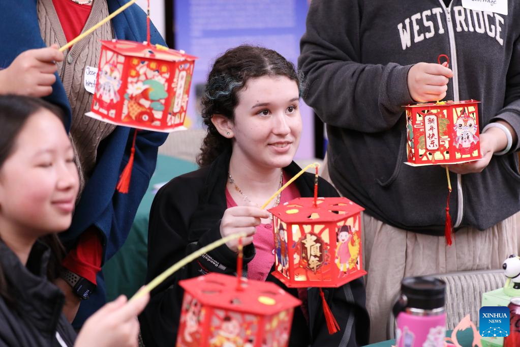American students showcase paper lanterns they created during a Chinese Lantern Festival celebration at the Chinese Consulate General in Los Angeles, California, the United States, on Feb. 12, 2025. Calligraphy, lantern-making, paper cutting, making dumplings and eating Tangyuan (glutinous rice balls) -- more than 100 American students and educators from four schools in Southern California were invited to experience Chinese culture on Wednesday at a pleasant Lantern Festival celebration hosted by the Chinese Consulate General in Los Angeles. (Photo by Qiu Chen/Xinhua)