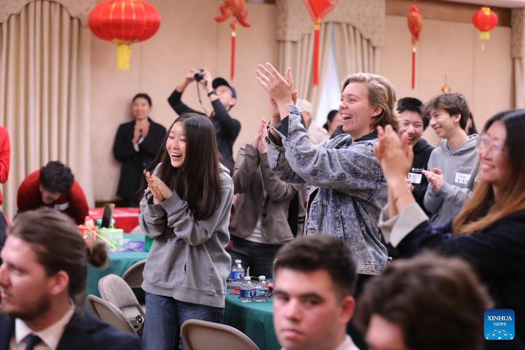 American students and teachers attend a Chinese Lantern Festival celebration at the Chinese Consulate General in Los Angeles, California, the United States, on Feb. 12, 2025. Calligraphy, lantern-making, paper cutting, making dumplings and eating Tangyuan (glutinous rice balls) -- more than 100 American students and educators from four schools in Southern California were invited to experience Chinese culture on Wednesday at a pleasant Lantern Festival celebration hosted by the Chinese Consulate General in Los Angeles. (Photo by Qiu Chen/Xinhua)
