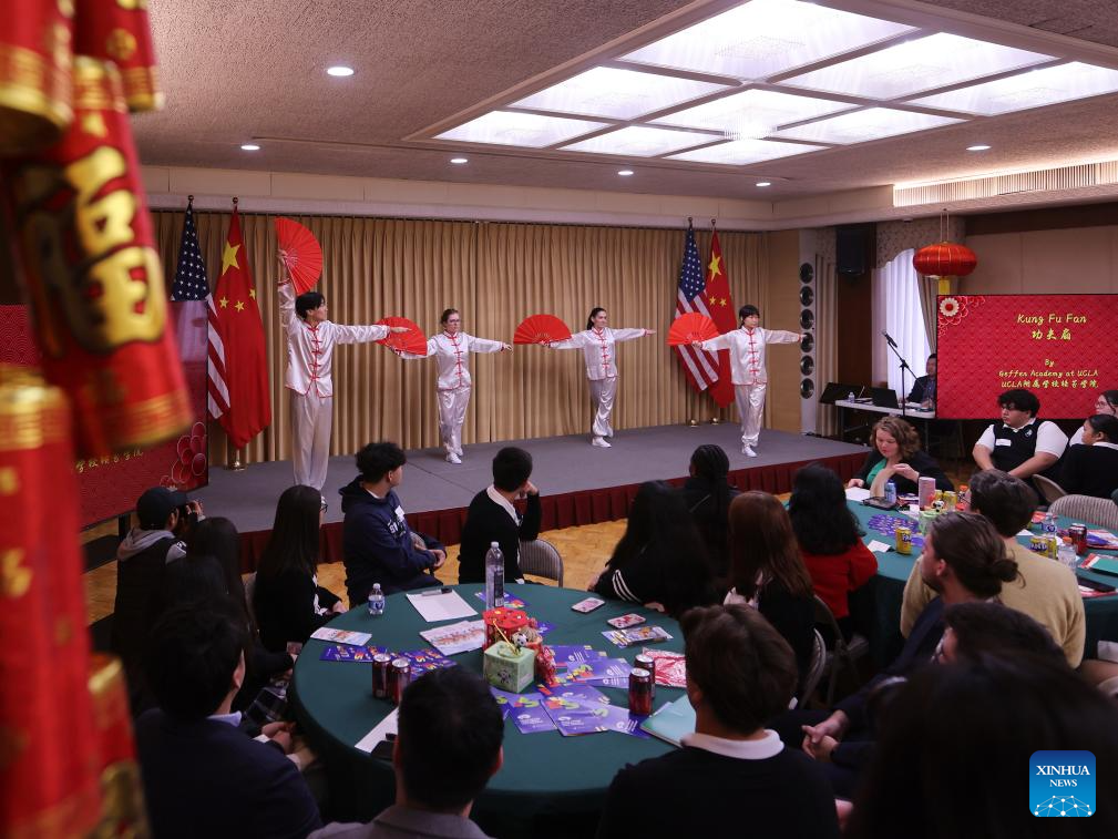 American students perform a Kung Fu Fan dance during a Chinese Lantern Festival celebration at the Chinese Consulate General in Los Angeles, California, the United States, on Feb. 12, 2025. Calligraphy, lantern-making, paper cutting, making dumplings and eating Tangyuan (glutinous rice balls) -- more than 100 American students and educators from four schools in Southern California were invited to experience Chinese culture on Wednesday at a pleasant Lantern Festival celebration hosted by the Chinese Consulate General in Los Angeles. (Photo by Qiu Chen/Xinhua)