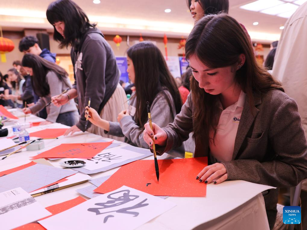 American students try Chinese calligraphy during a Chinese Lantern Festival celebration at the Chinese Consulate General in Los Angeles, California, the United States, on Feb. 12, 2025. Calligraphy, lantern-making, paper cutting, making dumplings and eating Tangyuan (glutinous rice balls) -- more than 100 American students and educators from four schools in Southern California were invited to experience Chinese culture on Wednesday at a pleasant Lantern Festival celebration hosted by the Chinese Consulate General in Los Angeles. (Photo by Qiu Chen/Xinhua)