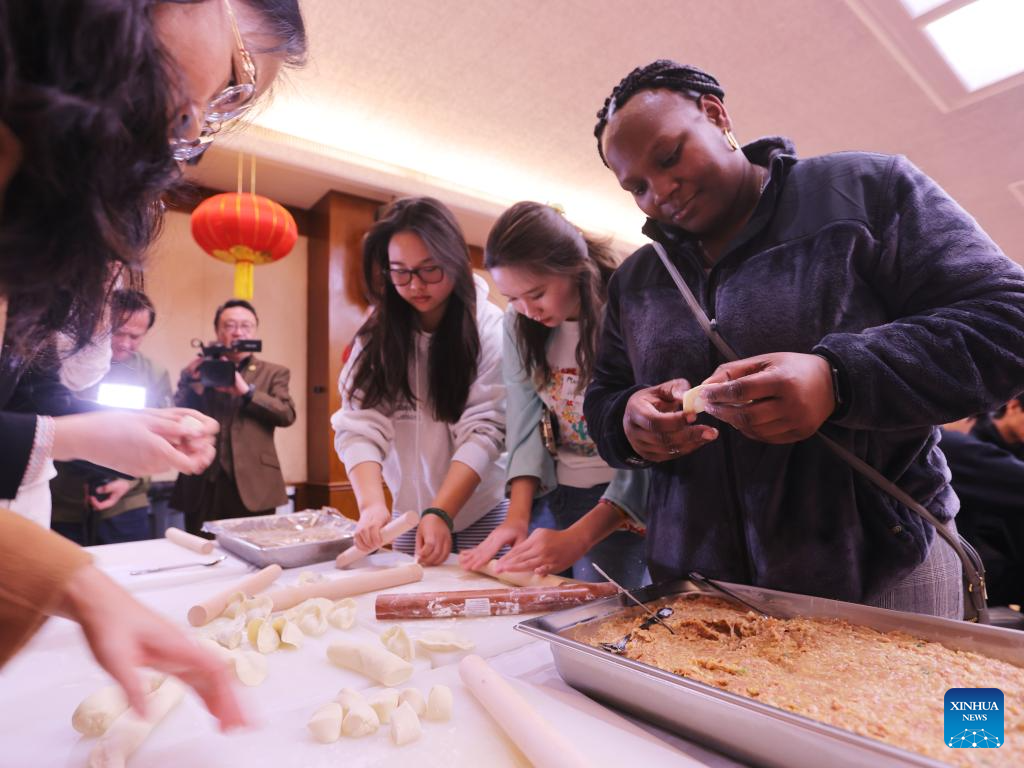 American students and teachers learn to make dumplings during a Chinese Lantern Festival celebration at the Chinese Consulate General in Los Angeles, California, the United States, on Feb. 12, 2025. Calligraphy, lantern-making, paper cutting, making dumplings and eating Tangyuan (glutinous rice balls) -- more than 100 American students and educators from four schools in Southern California were invited to experience Chinese culture on Wednesday at a pleasant Lantern Festival celebration hosted by the Chinese Consulate General in Los Angeles. (Photo by Qiu Chen/Xinhua)