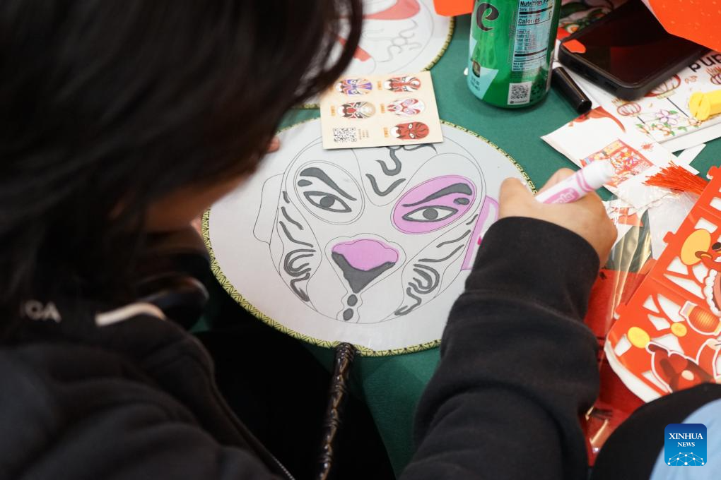 An American student paints Peking Opera facial makeup during a Chinese Lantern Festival celebration at the Chinese Consulate General in Los Angeles, California, the United States, on Feb. 12, 2025. Calligraphy, lantern-making, paper cutting, making dumplings and eating Tangyuan (glutinous rice balls) -- more than 100 American students and educators from four schools in Southern California were invited to experience Chinese culture on Wednesday at a pleasant Lantern Festival celebration hosted by the Chinese Consulate General in Los Angeles. (Photo by Zeng Hui/Xinhua)