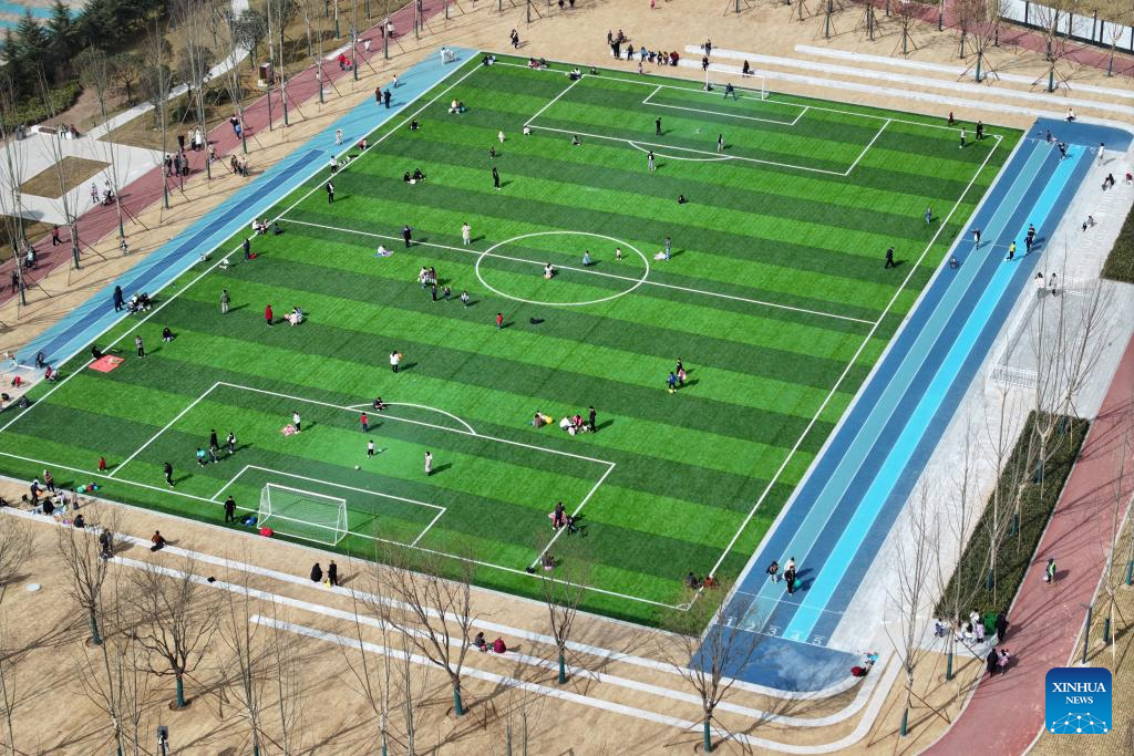 An aerial drone photo taken on Feb. 15, 2025 shows a football pitch inside a comprehensive park in Xi'an, northwest China's Shaanxi Province. Transformed from the railway remains and covering nearly 600,000 square meters, a comprehensive park has recently been open to public in Xi'an with functions including protection of remains, outdoor sport, recreation and entertainment. (Xinhua/Shao Rui)
