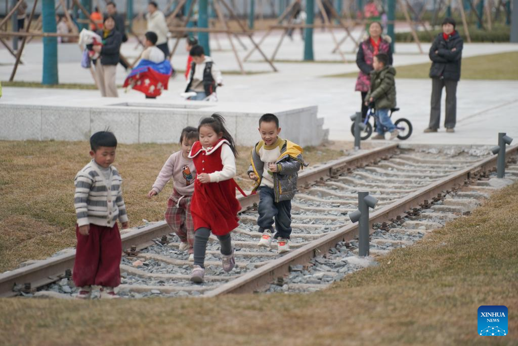 Children have fun at a comprehensive park in Xi'an, northwest China's Shaanxi Province, Feb. 15, 2025. Transformed from the railway remains and covering nearly 600,000 square meters, a comprehensive park has recently been open to public in Xi'an with functions including protection of remains, outdoor sport, recreation and entertainment. (Xinhua/Shao Rui)