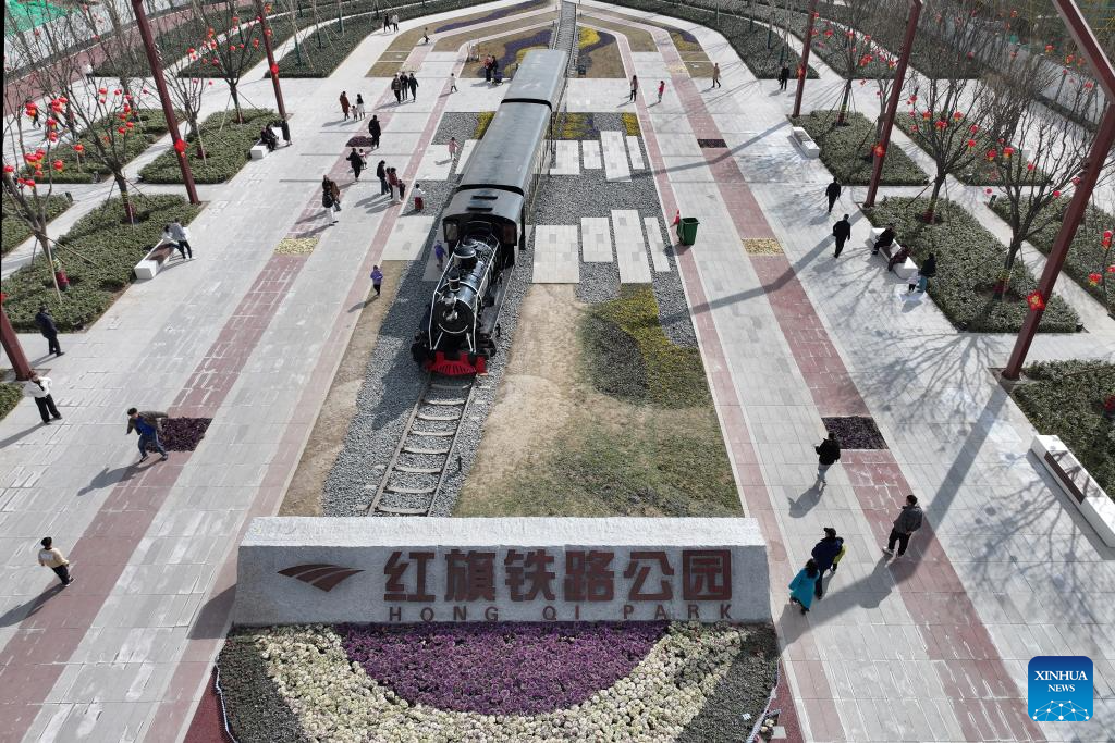 An aerial drone photo taken on Feb. 15, 2025 shows tourists having fun at a comprehensive park in Xi'an, northwest China's Shaanxi Province. Transformed from the railway remains and covering nearly 600,000 square meters, a comprehensive park has recently been open to public in Xi'an with functions including protection of remains, outdoor sport, recreation and entertainment. (Xinhua/Shao Rui)