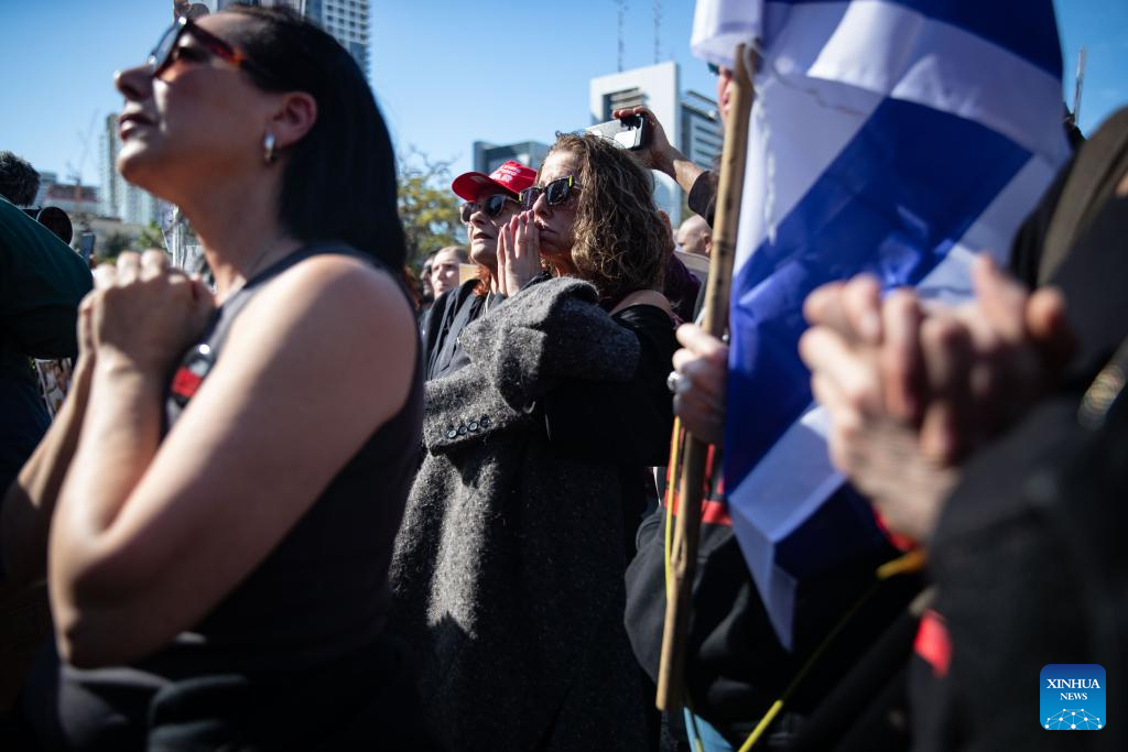 Supporters of the hostages watch the televised broadcast of the hostage release process through a big screen at a square in Tel Aviv, Israel, on Feb. 15, 2025. Hamas and Palestinian Islamic Jihad on Saturday handed over three Israeli hostages to the International Committee of the Red Cross in Khan Younis in southern Gaza Strip, as part of the sixth batch of the first phase of the ceasefire agreement. (Xinhua/Chen Junqing)