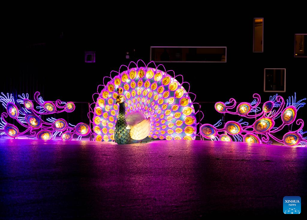 A peacock-shaped light installation is pictured during an international light show titled "Bright Nights" in Niagara-on-the-Lake, Ontario, Canada, Feb. 14, 2025. The outdoor light show is held here from Dec. 6, 2024 to March 1, 2025. (Photo by Zou Zheng/Xinhua)