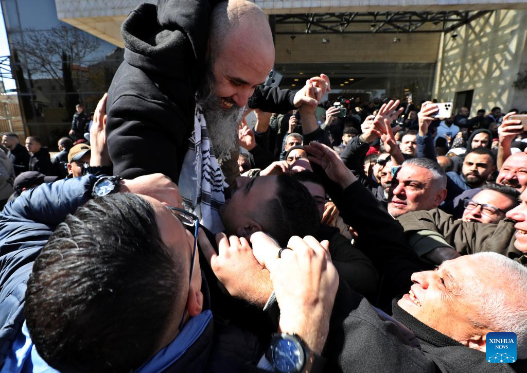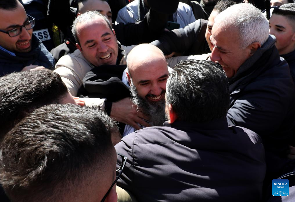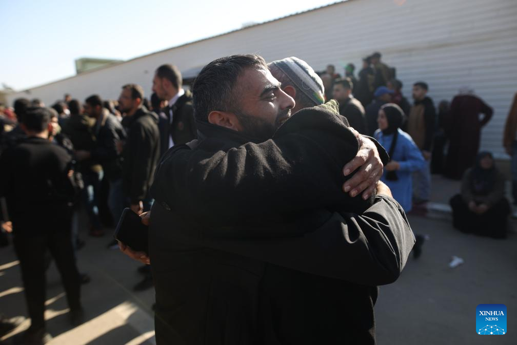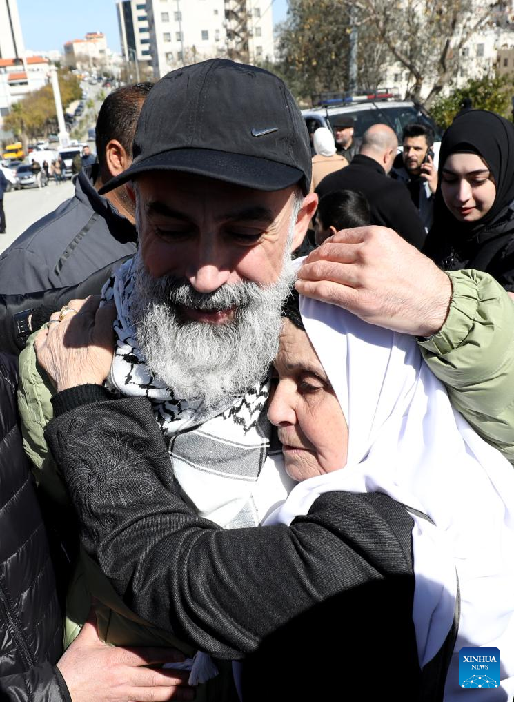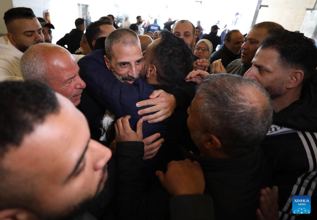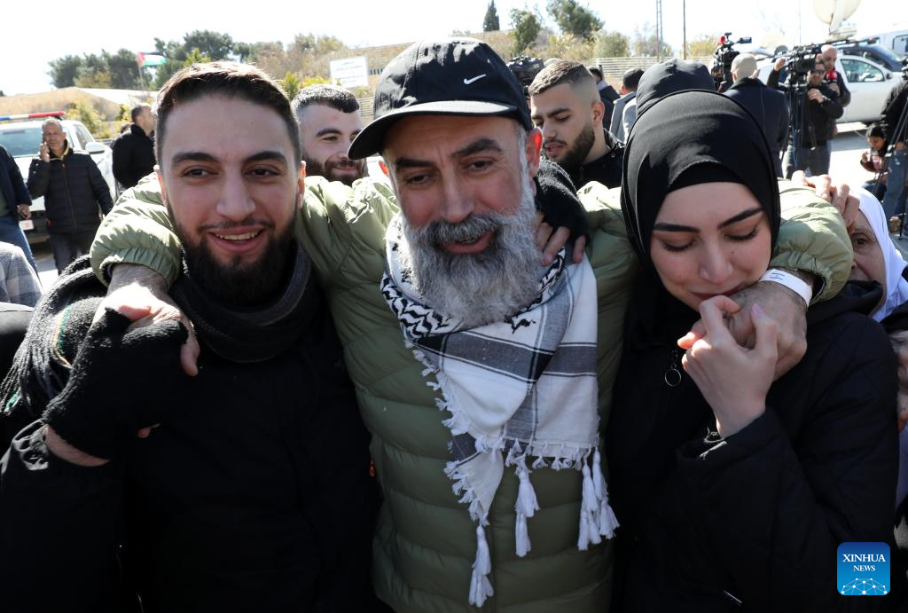 JERUSALEM/GAZA, Feb. 15 (Xinhua) -- The Palestinian militant groups on Saturday released three more Israeli hostages held in Gaza, while Israeli authorities freed 369 Palestinian prisoners and detainees in exchange.