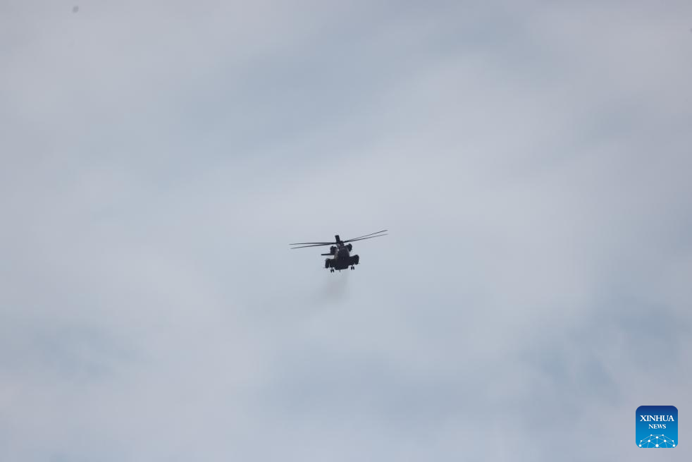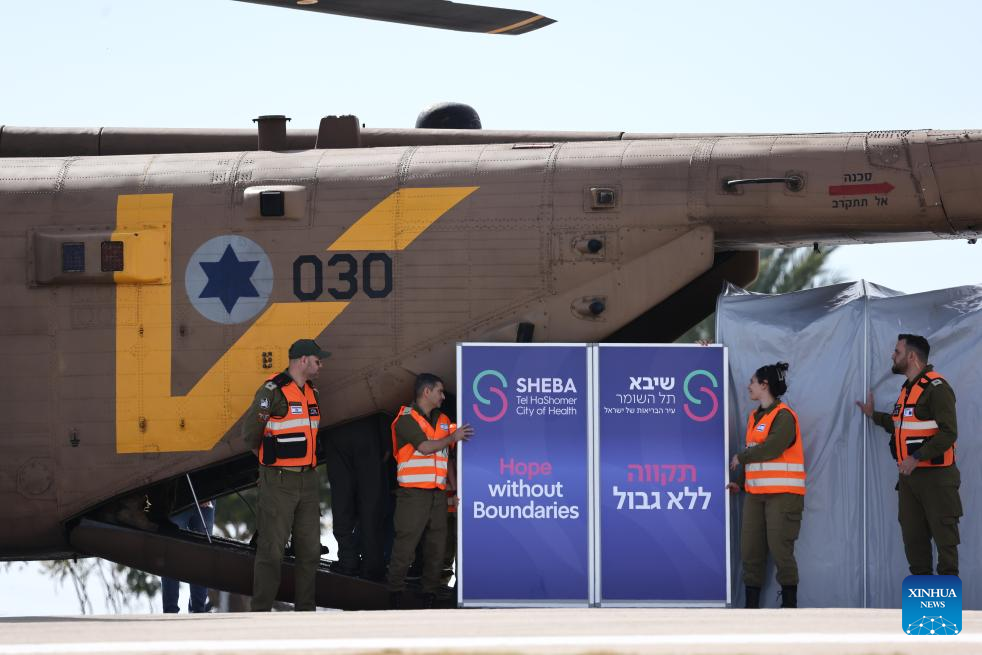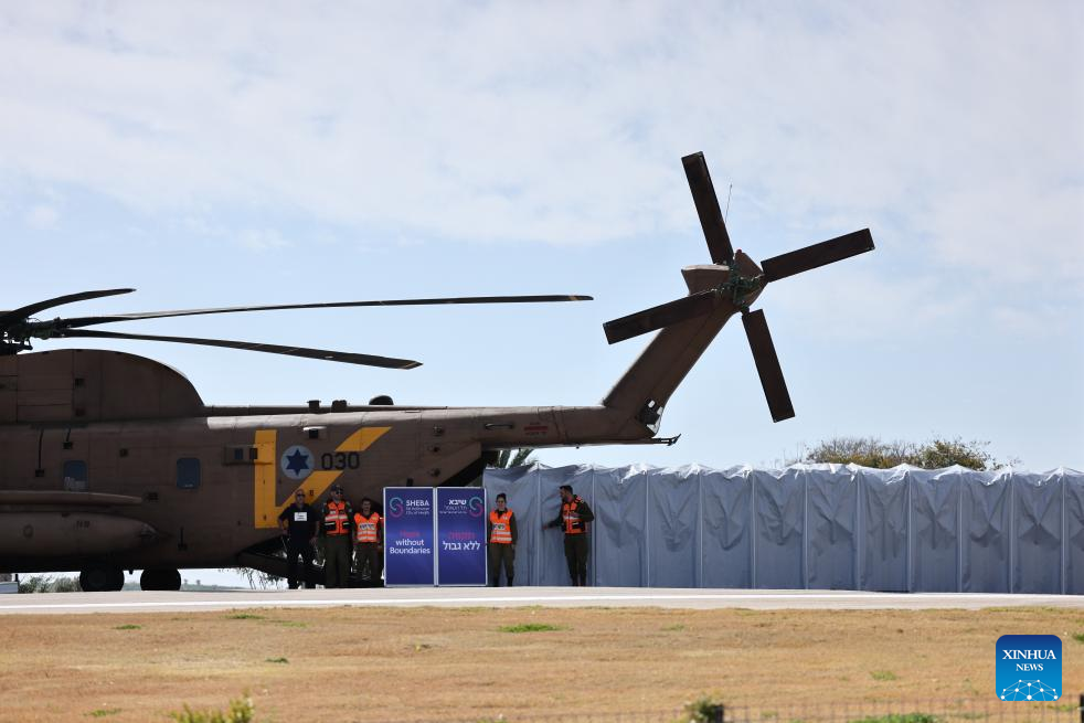A helicopter carrying released hostages arrives at a medical center in Ramat Gan, Israel, Feb. 15, 2025. (Tomer Neuberg/JINI via Xinhua)