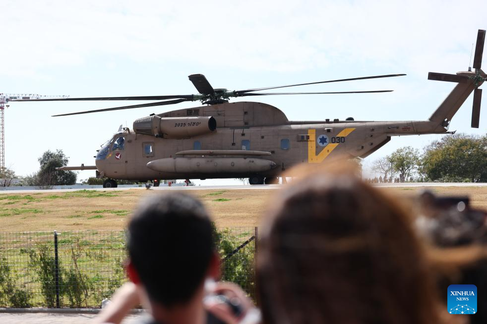 A helicopter carrying released hostages arrives at a medical center in Ramat Gan, Israel, Feb. 15, 2025. (Photo by Jamal Awad/Xinhua)