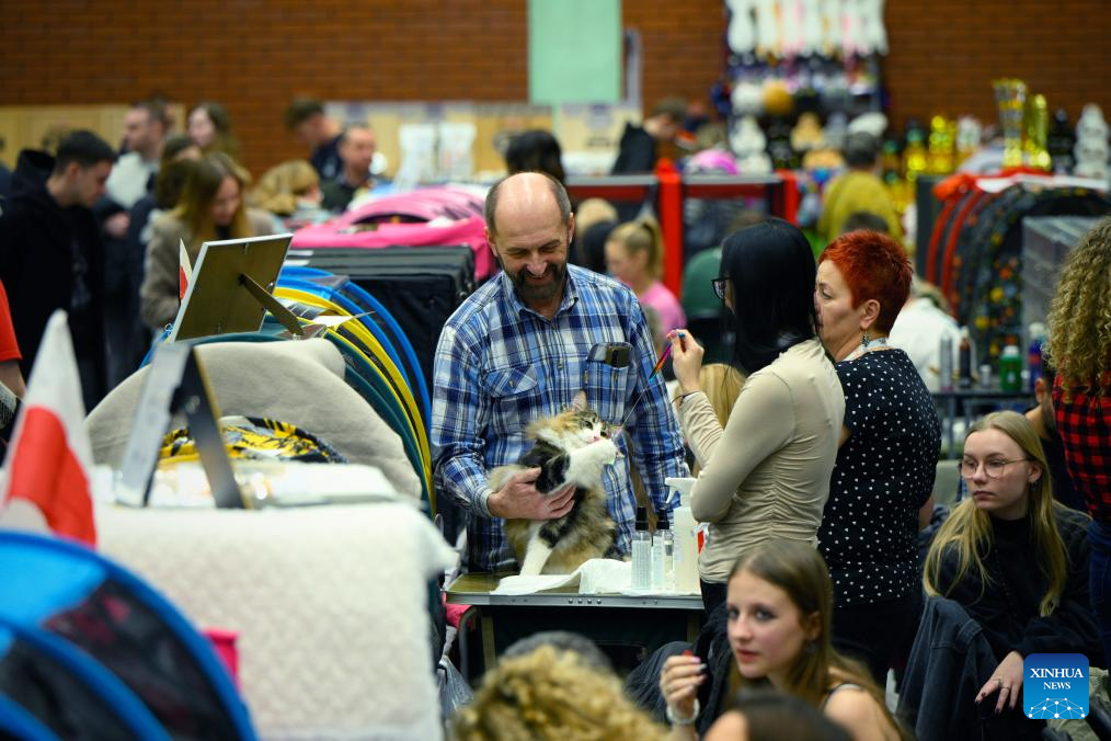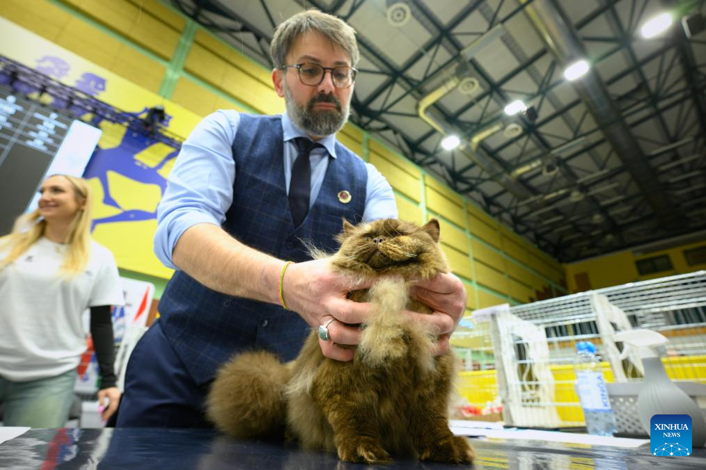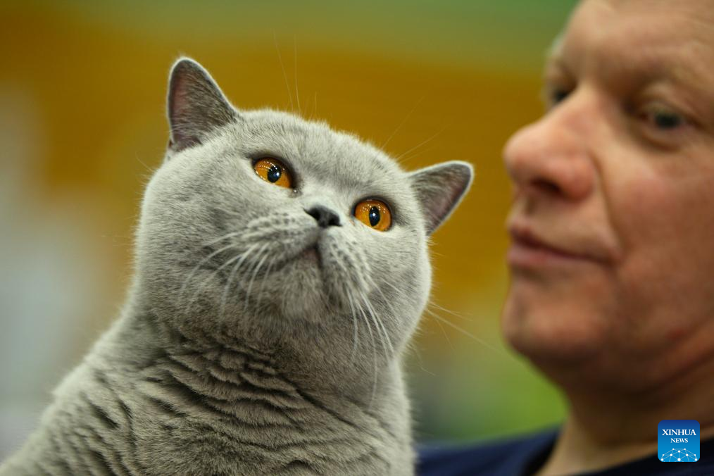 A participant holds a British Shorthair cat during the 2025 Central European Winner Show in Warsaw, Poland, Feb. 15, 2025. The event showcased purebred felines. (Photo by Jaap Arriens/Xinhua)