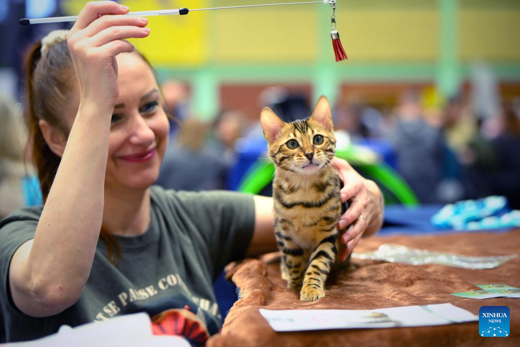 A participant plays with a Bengal cat during the annual Central European Winner Show competition in Warsaw, Poland, Feb. 15, 2025. The event showcased purebred felines. (Photo by Jaap Arriens/Xinhua)