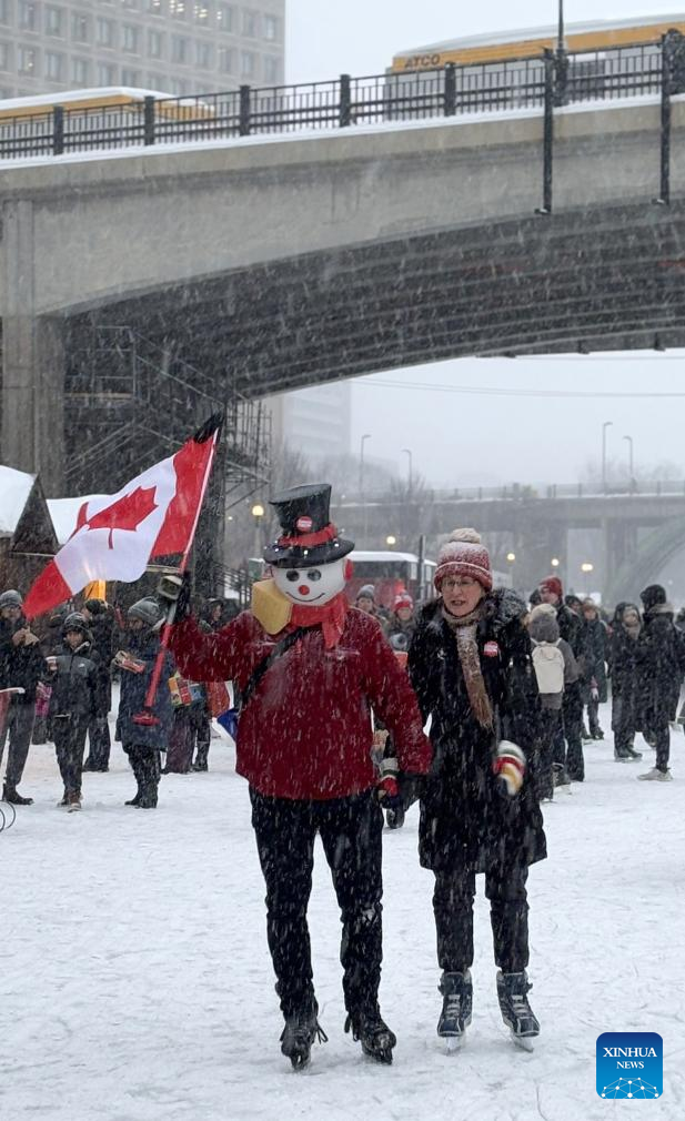 A skater carries national flag of Canada on the Rideau Canal Skateway in Ottawa, Canada on Feb. 15, 2025.