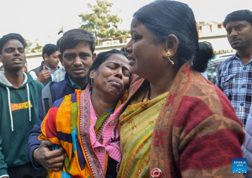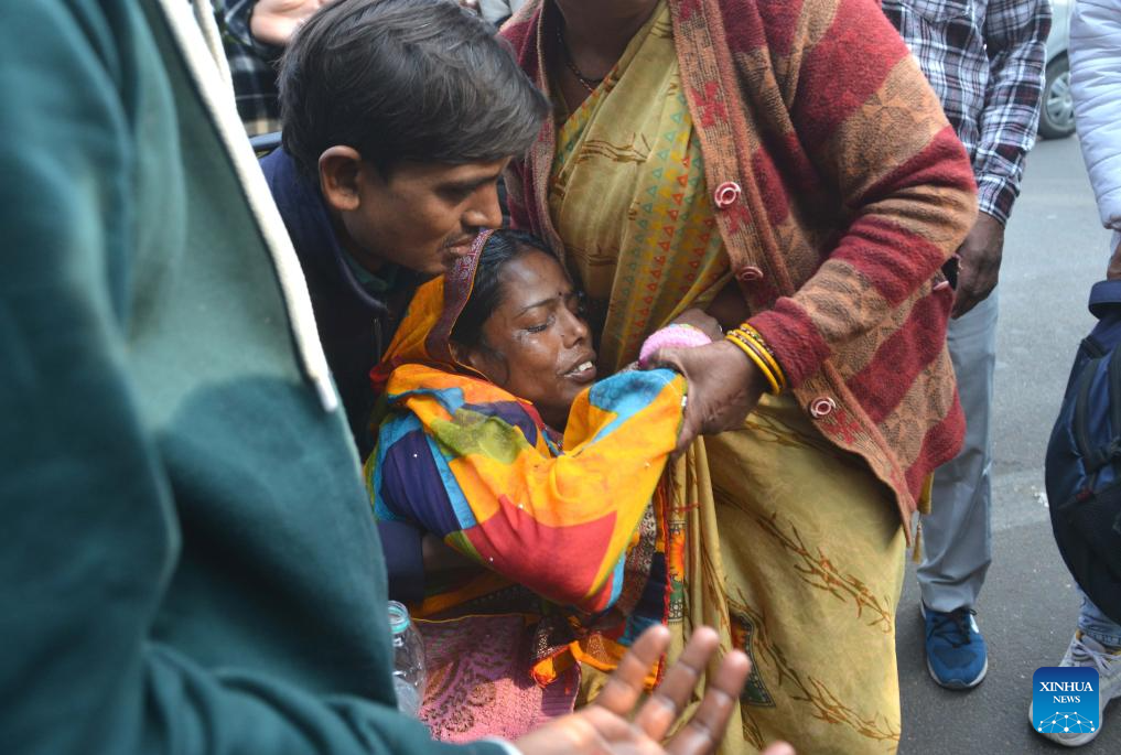 Relatives of a stampede victim mourn outside a hospital in New Delhi, India, Feb. 16, 2025. The death toll in Saturday's stampede at the New Delhi railway station rose to 18, confirmed a government official on Sunday.