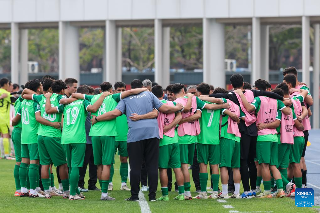 Players of Syria gather together before a Group D match between Syria and Japan at the AFC U20 Asian Cup 2025 in Shenzhen, south China's Guangdong Province, Feb.17, 2025. (Xinhua/Liang Xu)