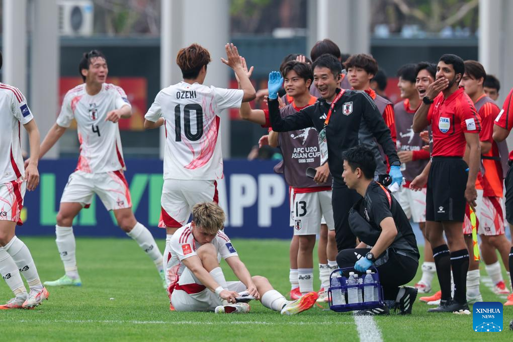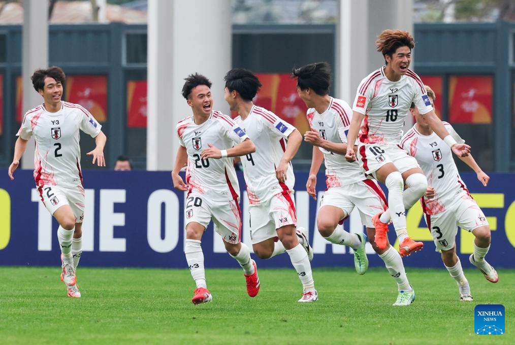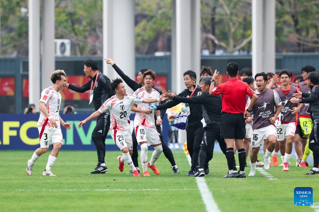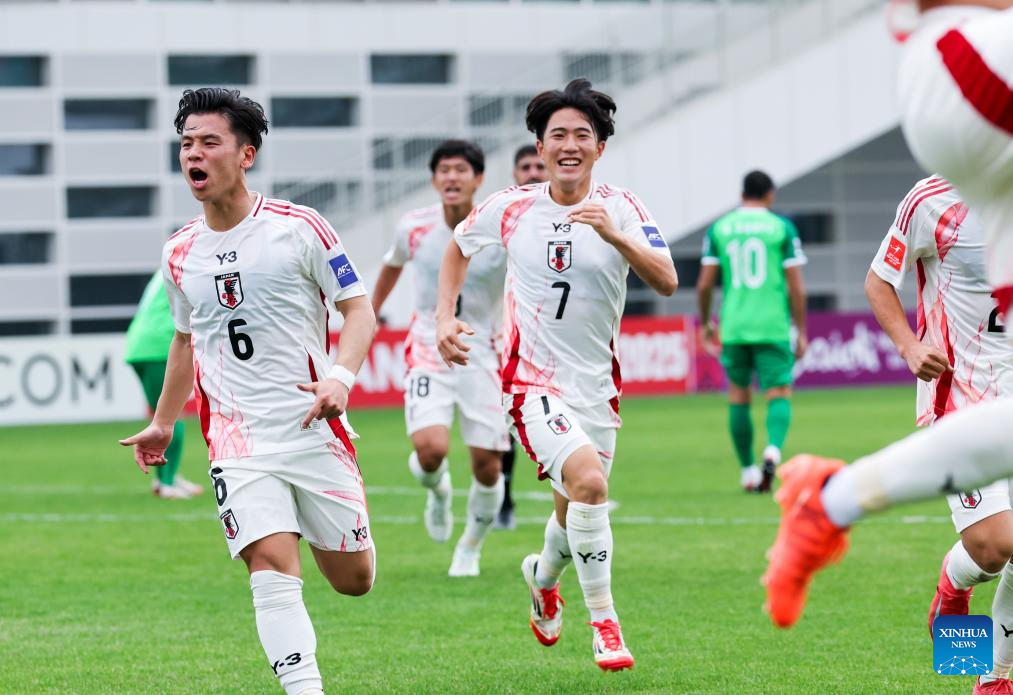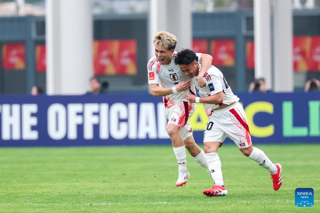 Players of Japan celebrate a goal during a Group D match between Syria and Japan at the AFC U20 Asian Cup 2025 in Shenzhen, south China's Guangdong Province, Feb.17, 2025. (Xinhua/Liang Xu)