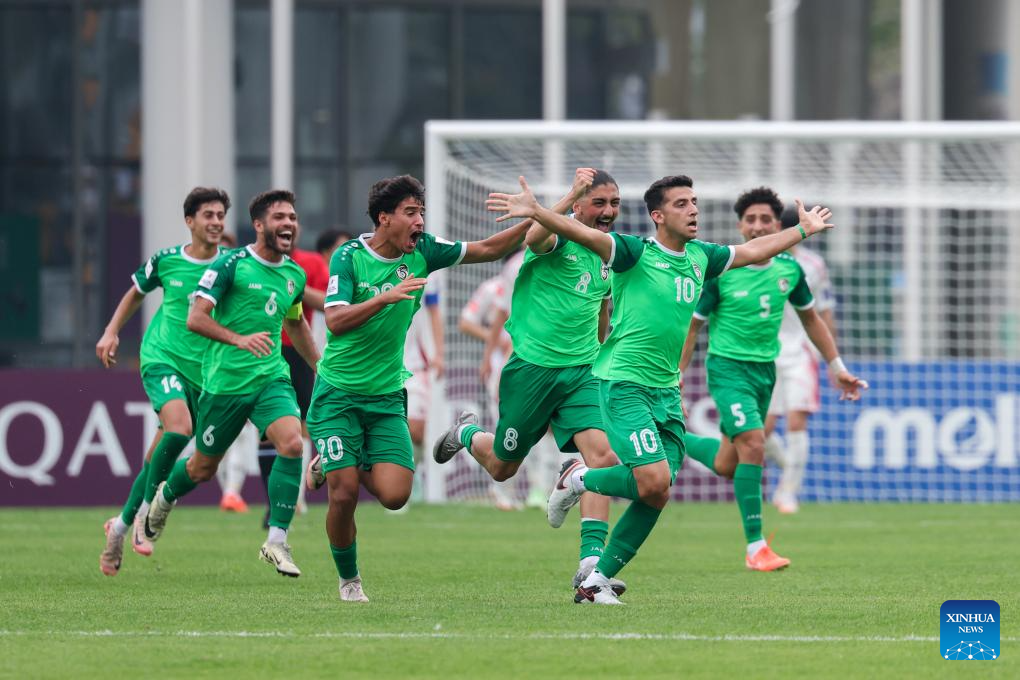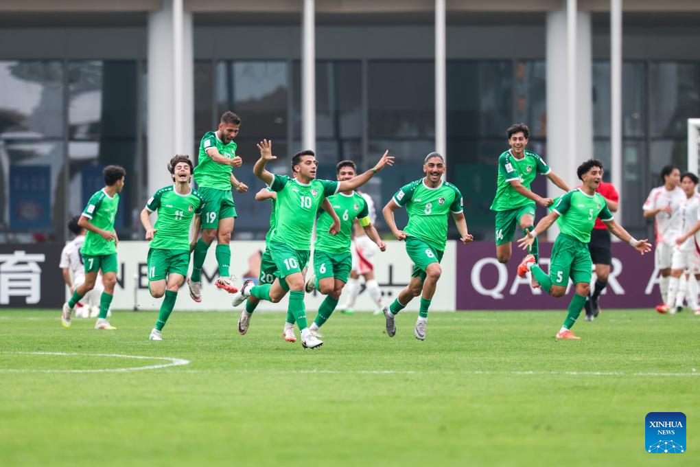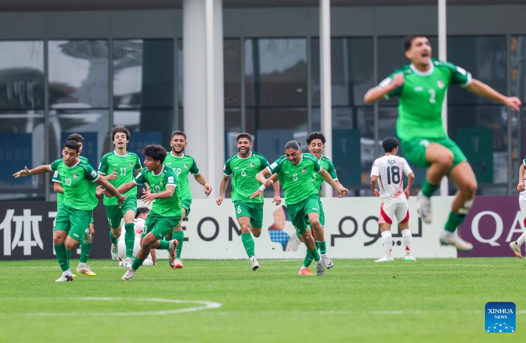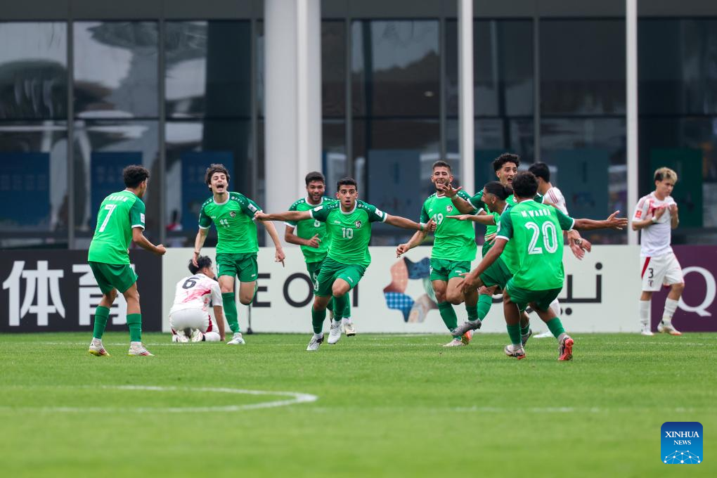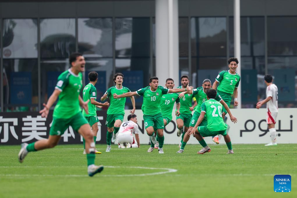 Players of Syria celebrate a goal during a Group D match between Syria and Japan at the AFC U20 Asian Cup 2025 in Shenzhen, south China's Guangdong Province, Feb.17, 2025. (Xinhua/Liang Xu)