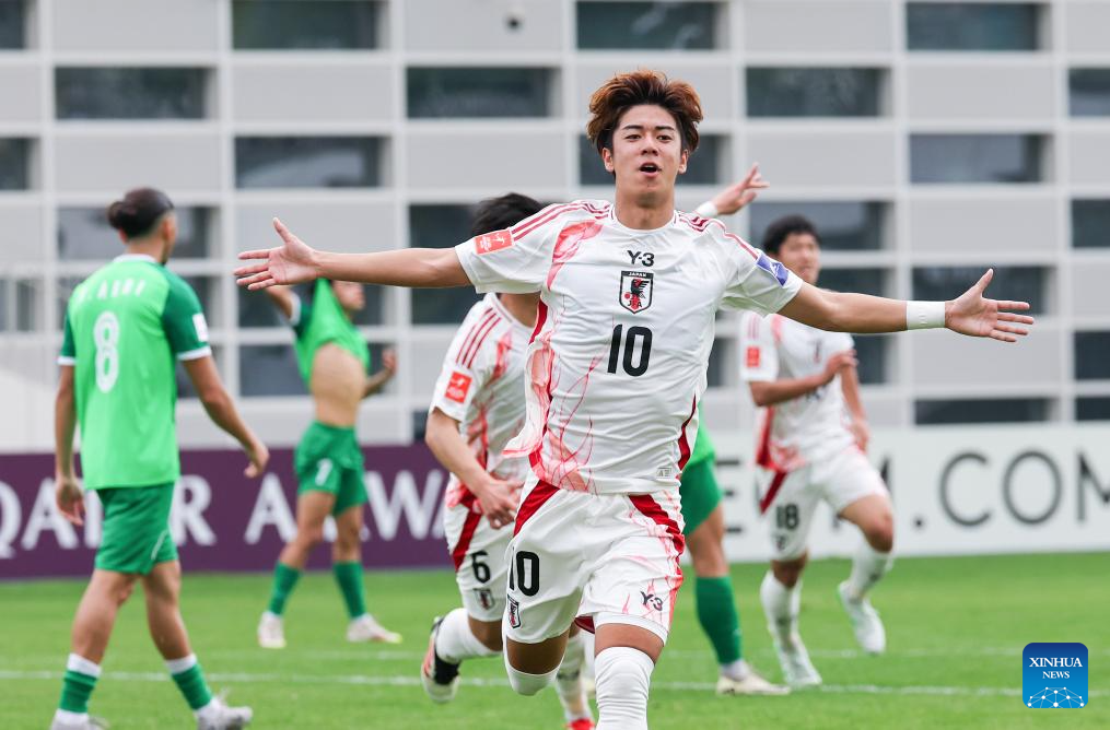 Ozeki Yuto of Japan celebrates his goal during a Group D match between Syria and Japan at the AFC U20 Asian Cup 2025 in Shenzhen, south China's Guangdong Province, Feb.17, 2025. (Xinhua/Liang Xu)