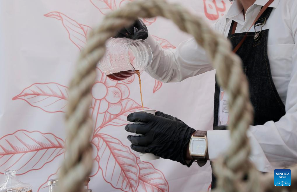 A barista serves coffee during the Sanaa Coffee Exhibition in Sanaa, Yemen, on Feb. 16, 2025.