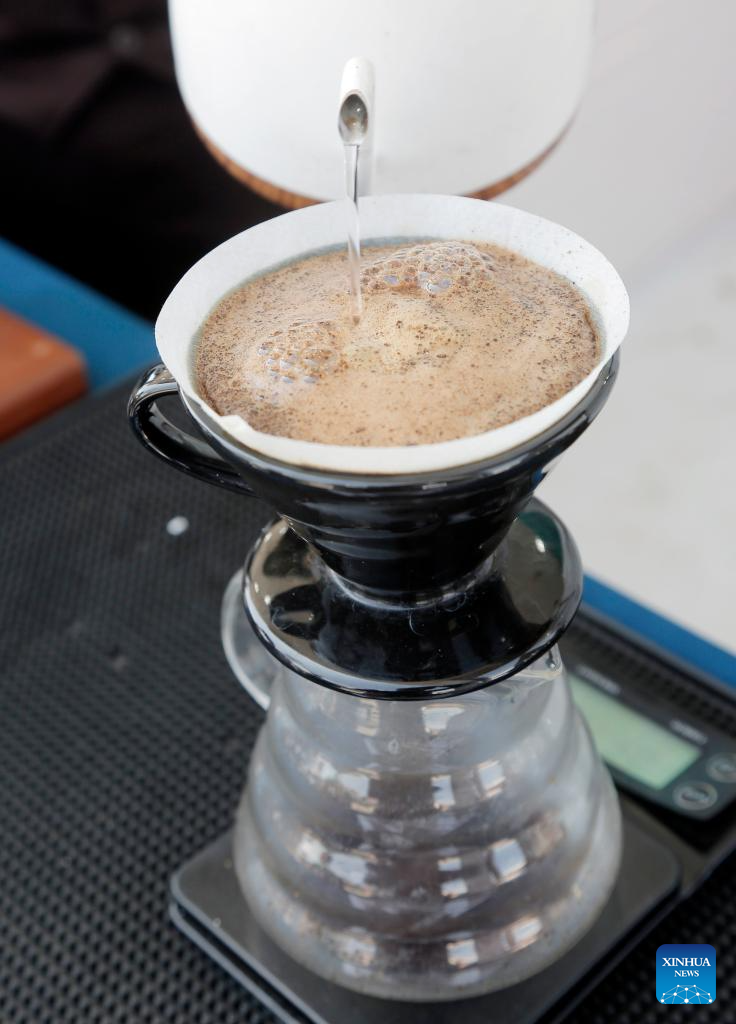 A barista brews coffee during the Sanaa Coffee Exhibition in Sanaa, Yemen, on Feb. 16, 2025.