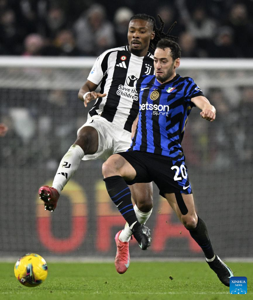 FC Juventus's Khephren Thuram (L) vies with Inter Milan's Hakan Calhanoglu during a Serie A football match between FC Juventus and Inter Milan in Turin, Italy, Feb. 16, 2025. (Photo by Alberto Lingria/Xinhua)