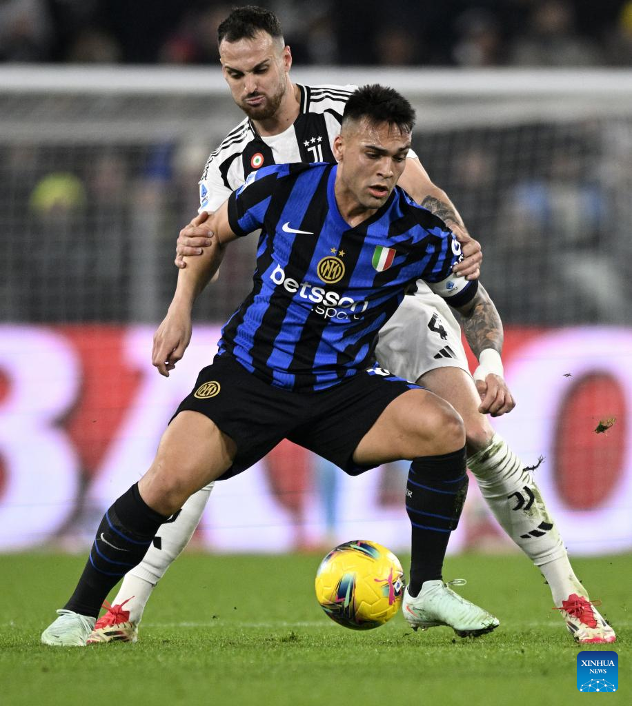 FC Juventus's Renato Verga (R) vies with Inter Milan's Lautaro Martinez during a Serie A football match between FC Juventus and Inter Milan in Turin, Italy, Feb. 16, 2025. (Photo by Alberto Lingria/Xinhua)