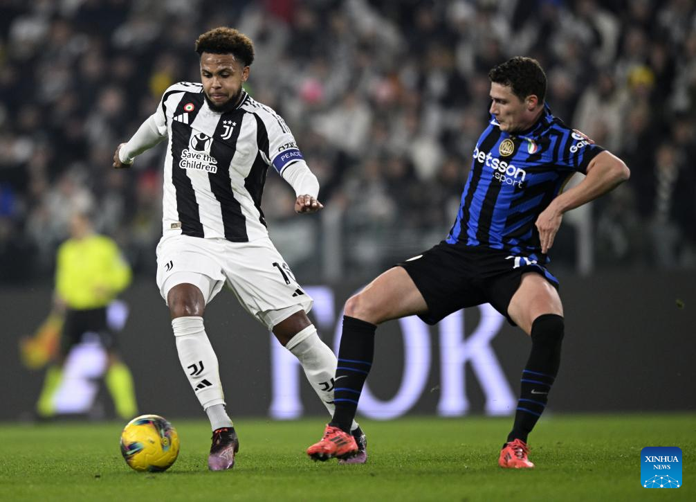 FC Juventus's Weston Mckennie (L) vies with Inter Milan's Benjamin Pavard during a Serie A football match between FC Juventus and Inter Milan in Turin, Italy, Feb. 16, 2025. (Photo by Alberto Lingria/Xinhua)