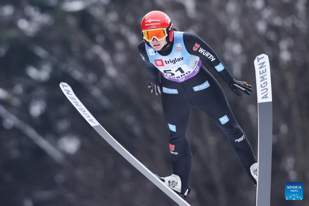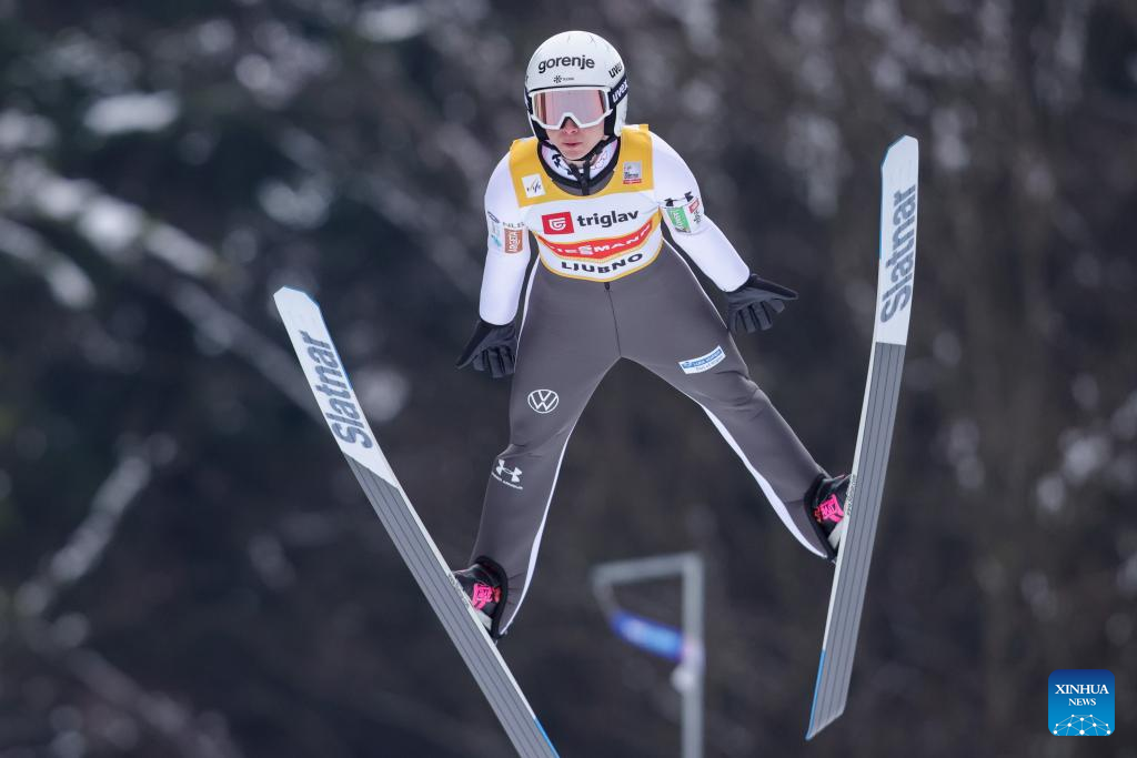 Selina Freitag of Germany competes during the Women's Normal Hill HS94 Individual at the Viesmann FIS Ski Jumping World Cup in Ljubno, Slovenia, Feb. 16, 2025. (Photo by Zeljko Stevanic/Xinhua)