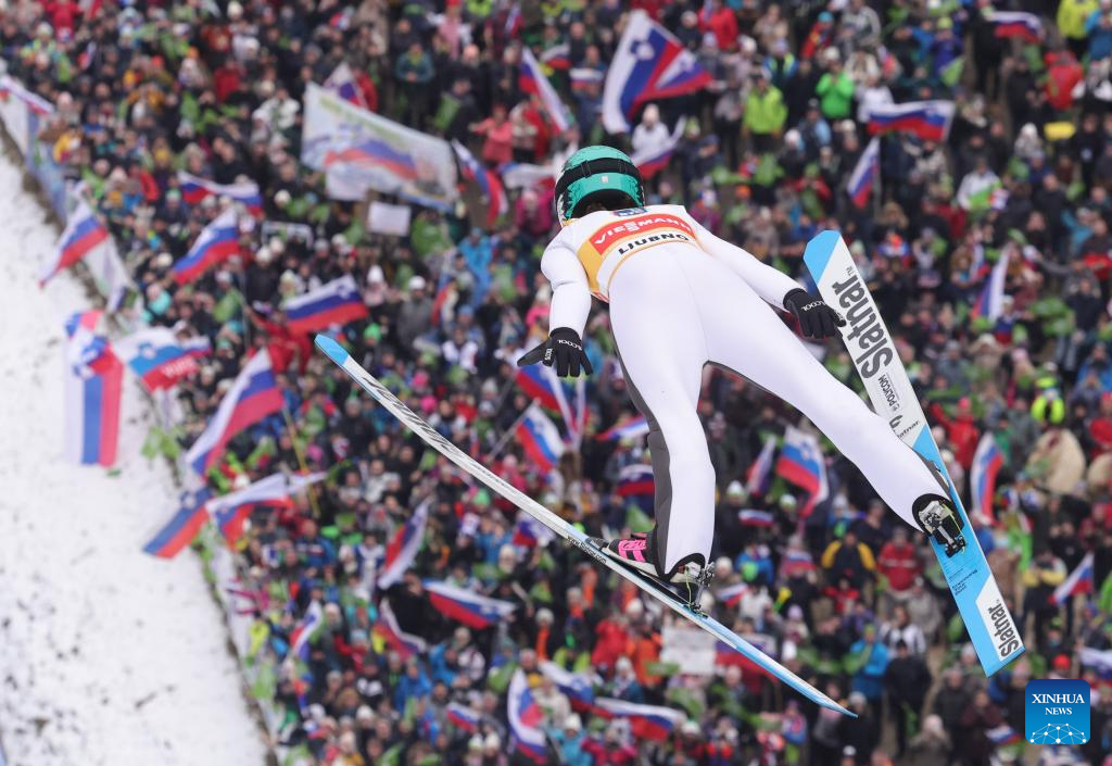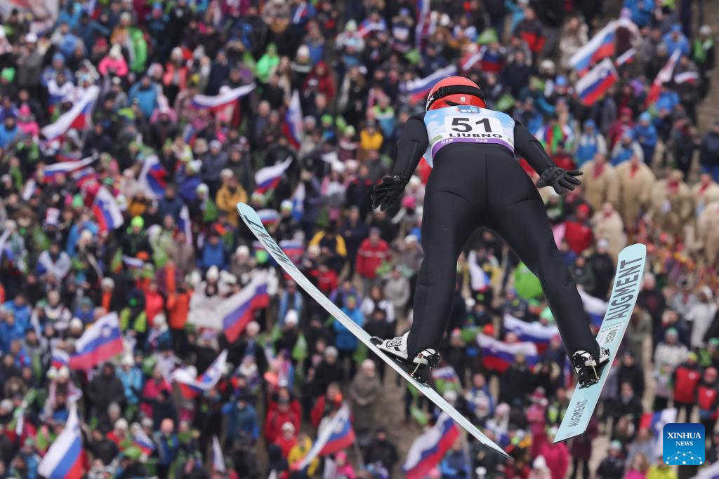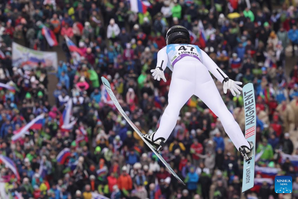 Nika Prevc of Slovenia competes during the Women's Normal Hill HS94 Individual at the Viesmann FIS Ski Jumping World Cup in Ljubno, Slovenia, Feb. 16, 2025. (Photo by Zeljko Stevanic/Xinhua)