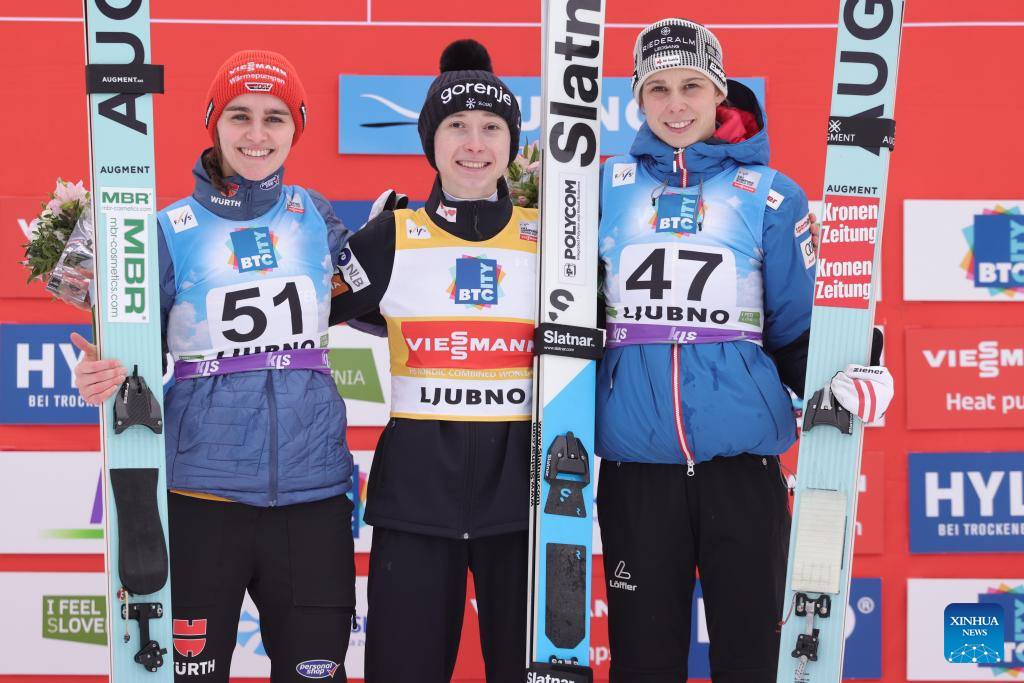 Gold medalist Nika Prevc (C) of Slovenia, silver medalist Selina Freitag (L) of Germany and bronze medalist Lisa Eder of Austria pose for photo after the Women's Normal Hill HS94 Individual at the Viesmann FIS Ski Jumping World Cup in Ljubno, Slovenia, Feb. 16, 2025. (Photo by Zeljko Stevanic/Xinhua)