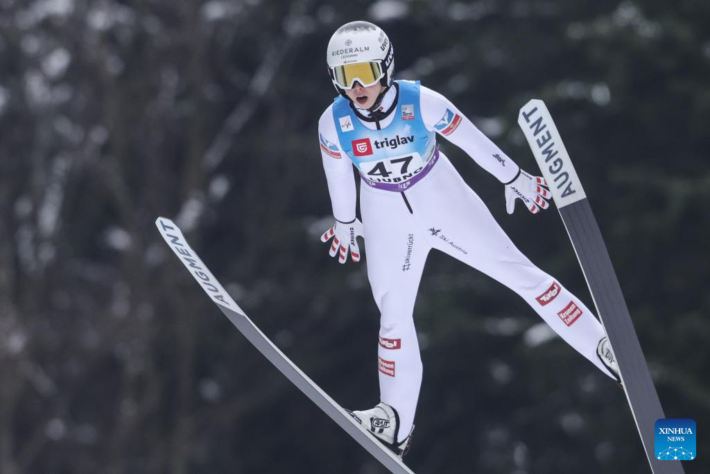 Lisa Eder of Austria competes during the Women's Normal Hill HS94 Individual at the Viesmann FIS Ski Jumping World Cup in Ljubno, Slovenia, Feb. 16, 2025. (Photo by Zeljko Stevanic/Xinhua)